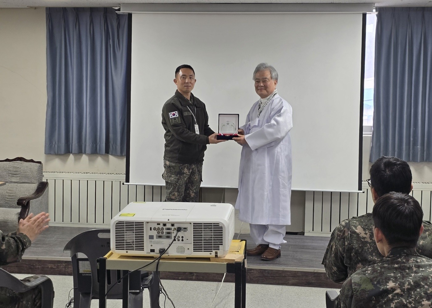 2024년 2월 29일, 사단법인 훈민정음기념사업회 박재성 이사장은 경기도 포천 소재 제5군단 본부대장 구만웅 소령의 초청으로 장병 및 군무원 50여 명을 대상으로 「훈민정음의 오해와 진실」 특강을 진행하였습니다. 본부대장 구만웅 소령은 박재성 이사장에게 감사패를 수여하였습니다.