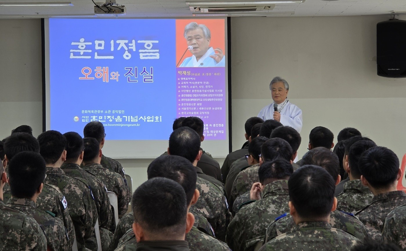 2024년 2월 29일, 사단법인 훈민정음기념사업회 박재성 이사장은 105정보통신여단(제5군단 예하) 여단장 임성용 대령의 초청으로 부대를 방문하였습니다. 이날 장병 및 군무원 170여 명을 대상으로 「훈민정음의 오해와 진실」을 주제로 2시간 특강을 진행하였으며, 임성용 여단장은 박재성 이사장에게 감사패를 수여하며 감사의 뜻을 전하였습니다.