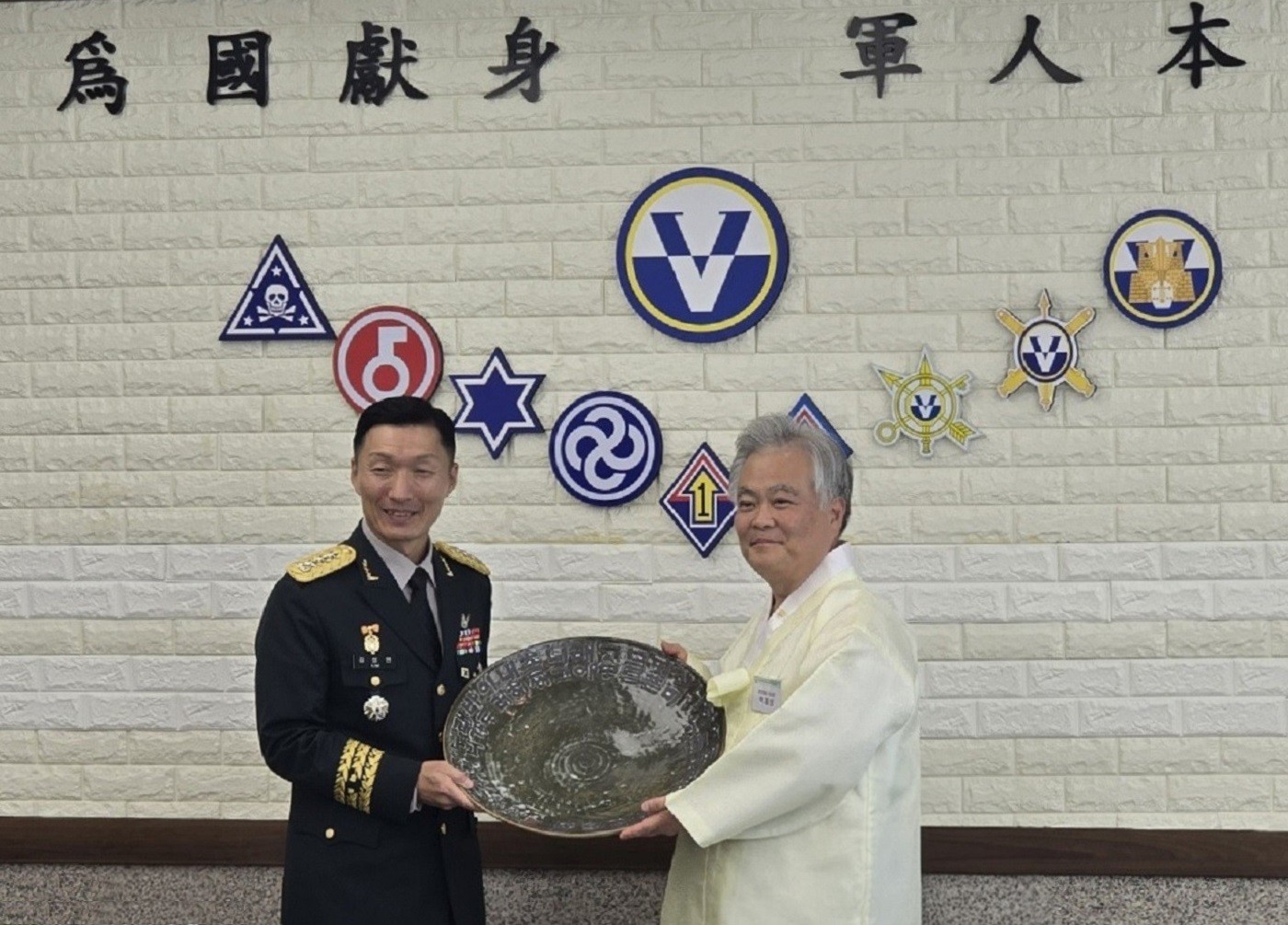 5군단장 김성민 중장의 환영을 받고 기념 촬영하는 박재성 이사장(박이사장 좌측은 5군단 정훈실장 변수진 대령)