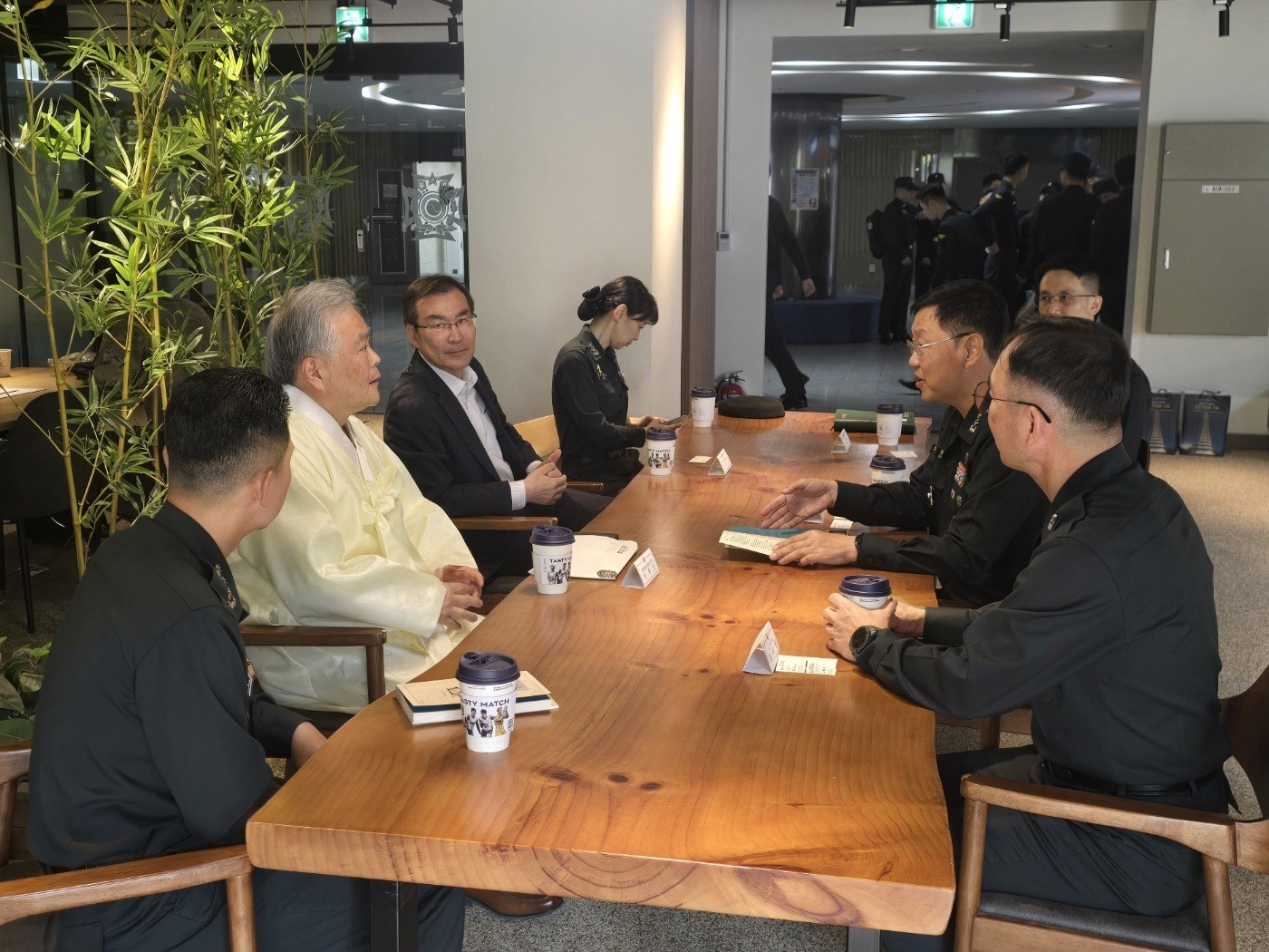 강연에 앞서 박재성 이사장은 학교장 소형기 소장, 생도대장 오세웅 준장, 국어철학과장 이지수 중령, 전자공학과 교수 김용철 대령, 제57대 육군사관학교장 강창구 예비역 중장과 환담을 나누었으며, 저서 『소설로 만나는 세종실록 속 훈민정음』과 『훈민정음에서 길을 찾는다』를 증정하였습니다. 강의 종료 후 생도대장 오세웅 준장은 감사패와 육사 방문 기념품을 전달하며 감사의 뜻을 전하였습니다.