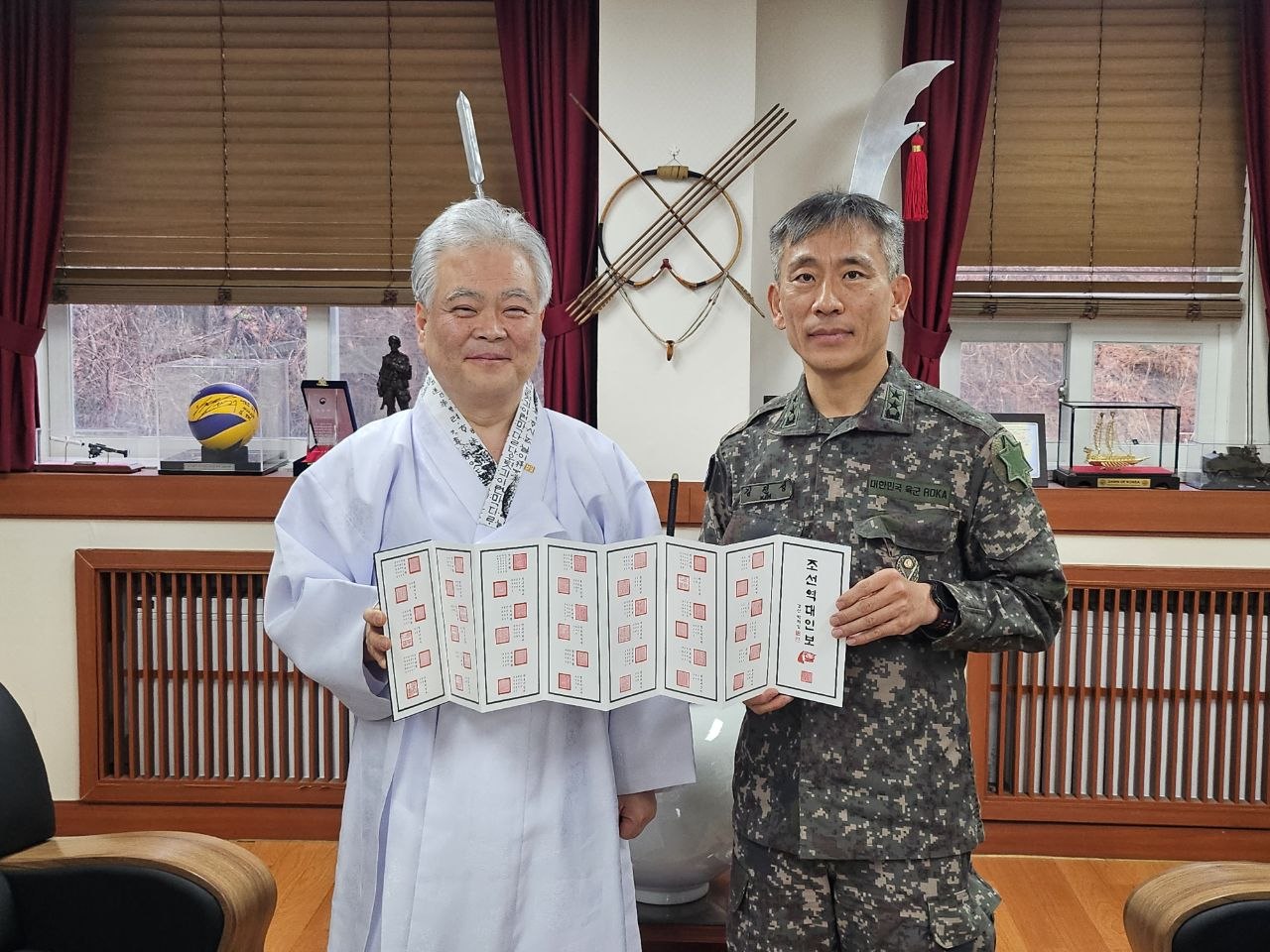 강연에 앞서 『훈민정음 해례본』과 병풍을 증정했으며, 김진성 사단장은 이를 부대 도서관에 비치해 전 장병이 열람할 수 있도록 하겠다고 밝혔습니다.