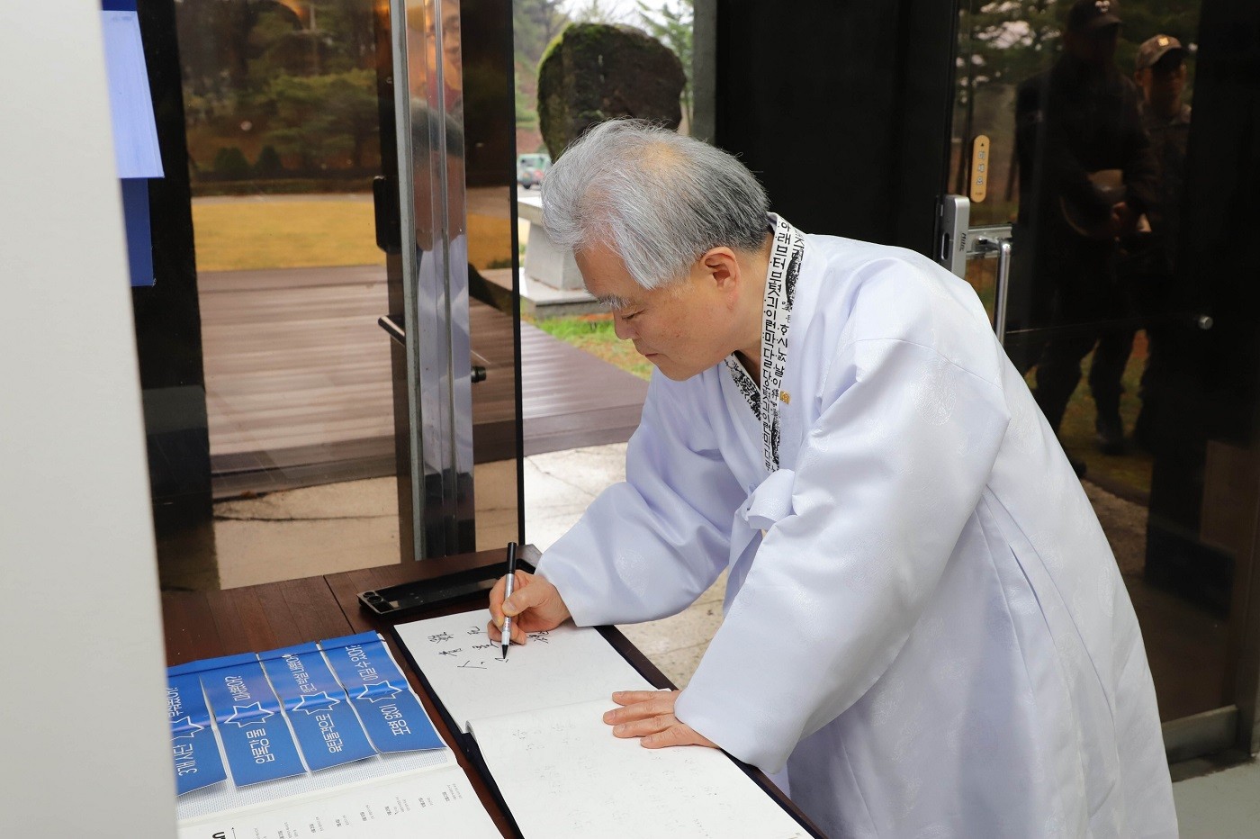 6사단 역사 박물관을 방문하여 방명록에 서명하는 박재성 이사장