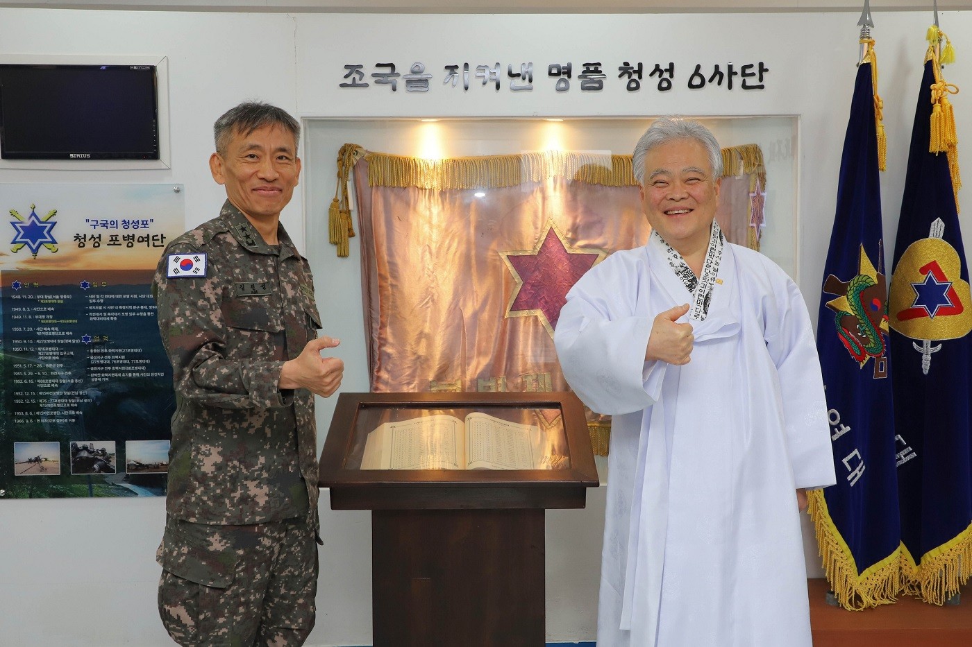 6사단 역사 박물관을 둘러본 후 김진성 사단장과 6사단을 표현하는 주먹을 쥐며 기념사진을 찍는 박재성 이사장