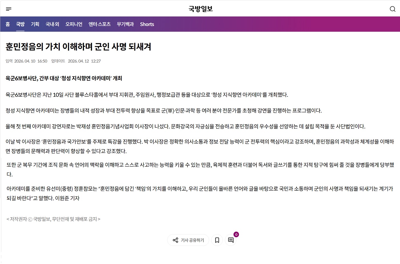 [국방일보] 훈민정음의 가치 이해하며 군인 사명 되새겨