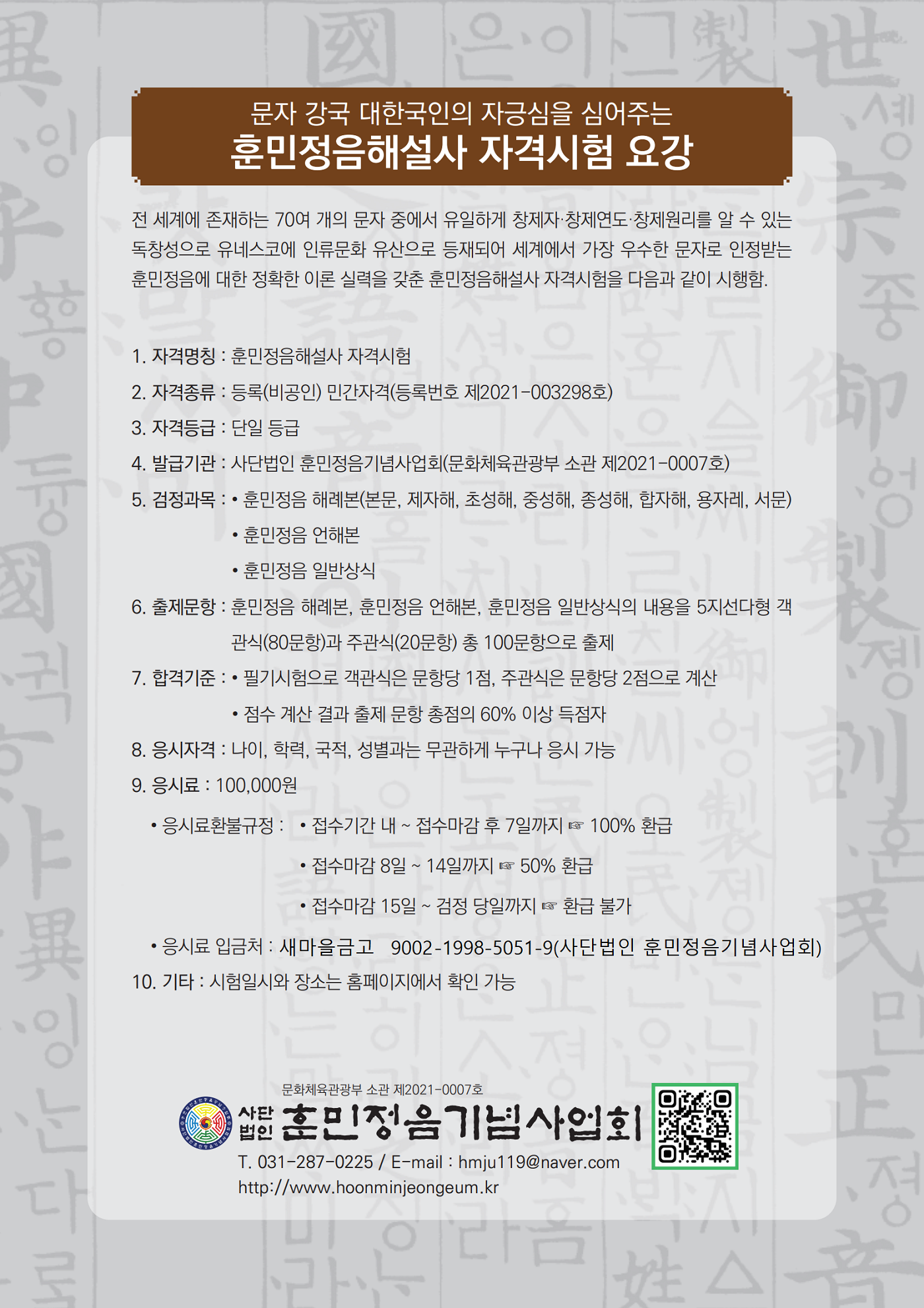 • 입금처 : 새마을금고 9002-1998-5051-9 (사단법인 훈민정음기념사업회)
