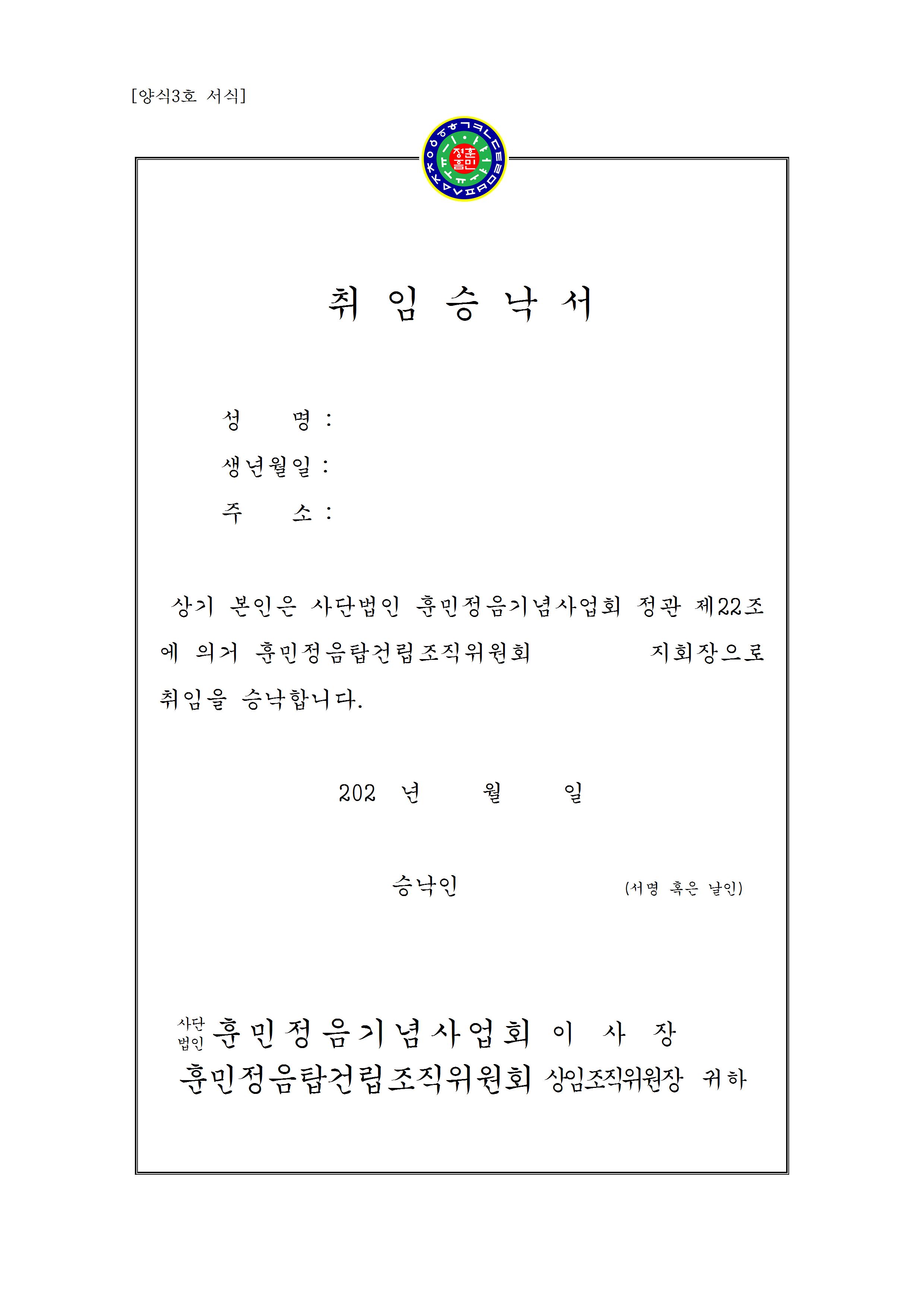 [양식3호] 훈민정음탑건립조직위원회 지회장 취임승낙서