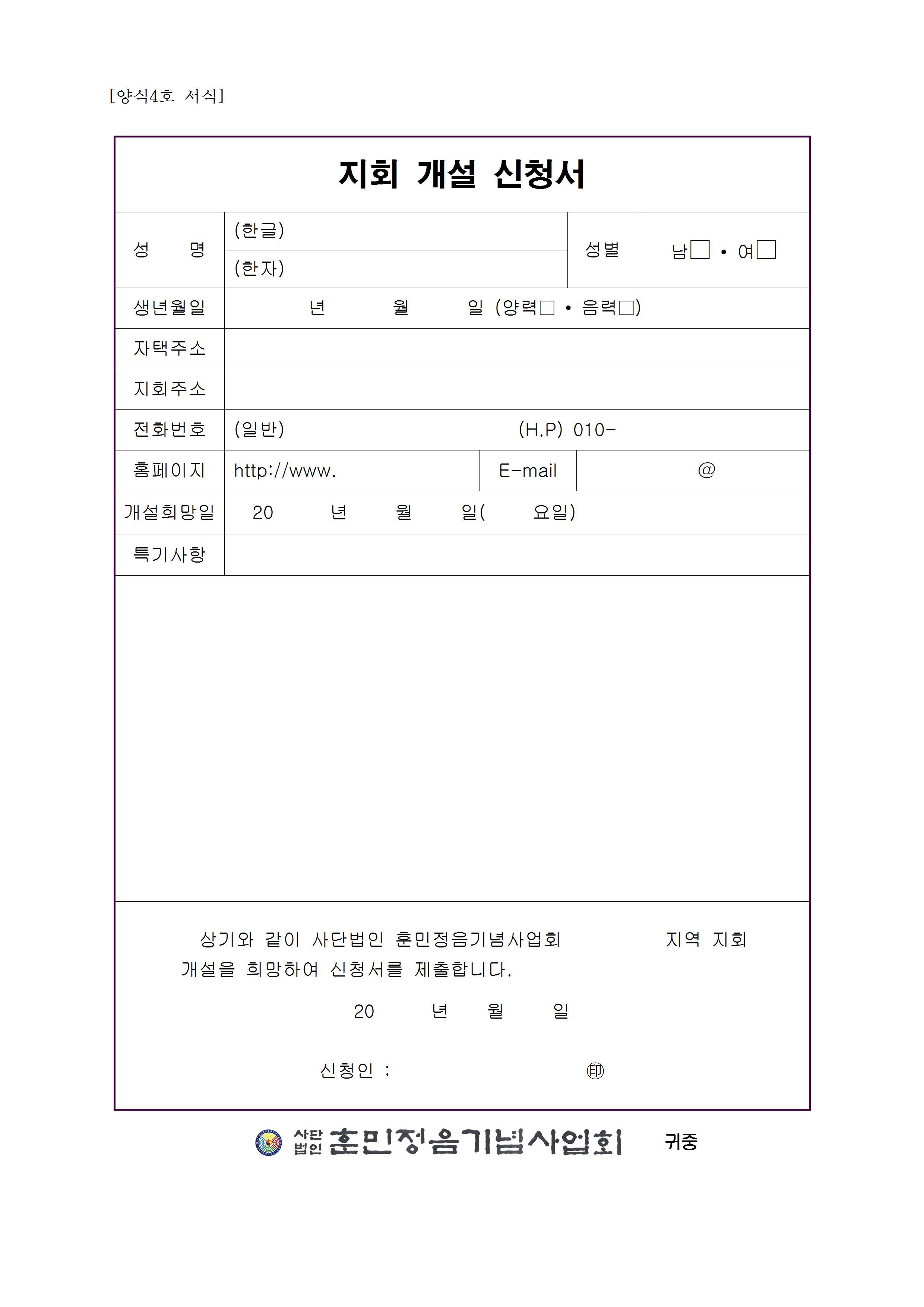 [양식4호] 사단법인 훈민정음기념사업회 지회개설 신청서