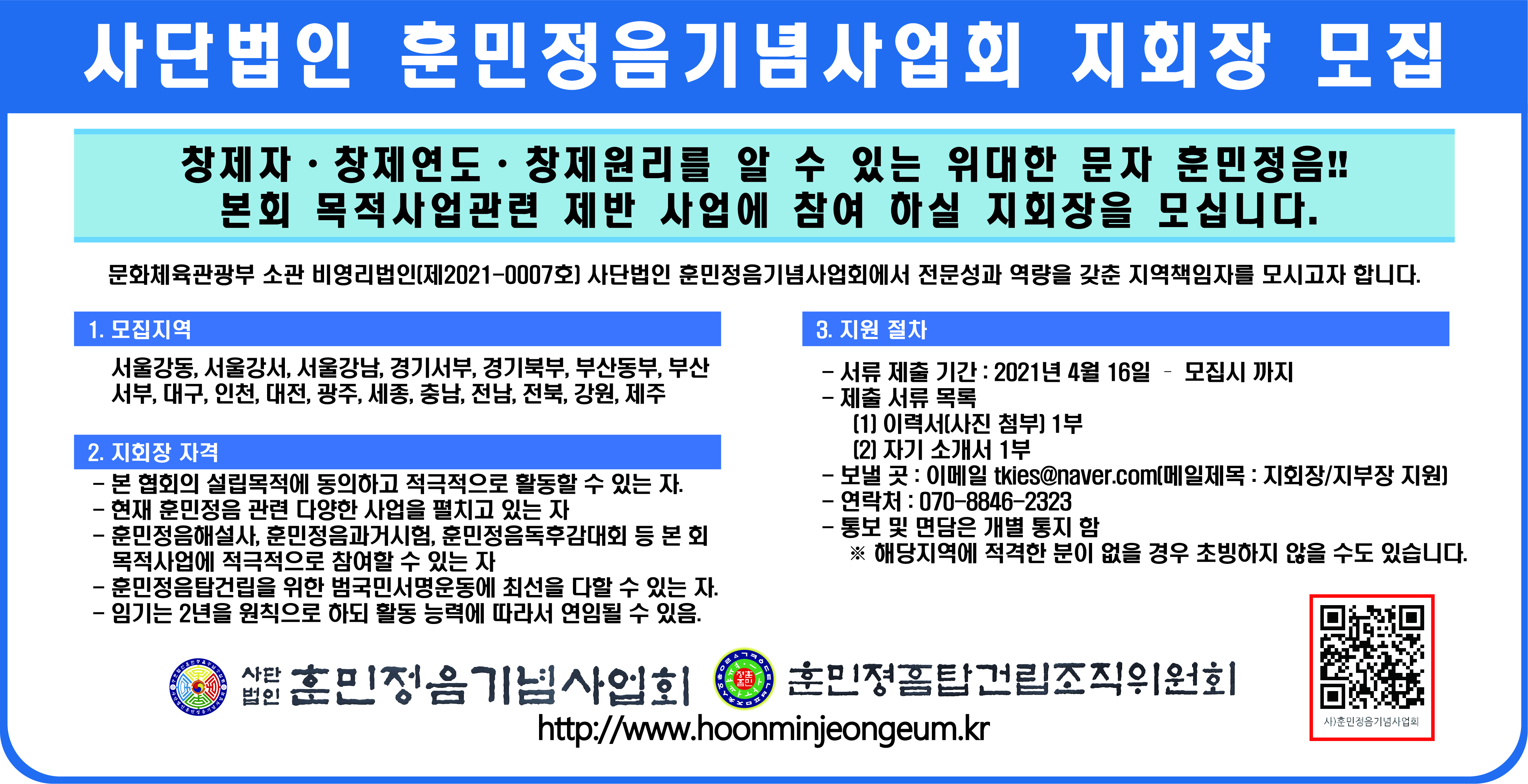 사단법인 훈민정음기념사업회 지회(지부)장 모집 공고