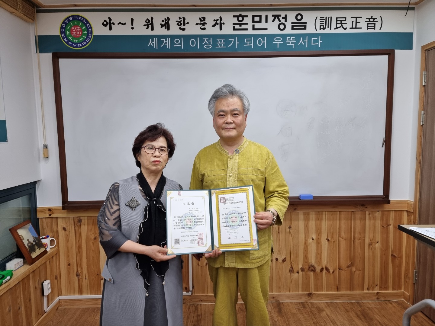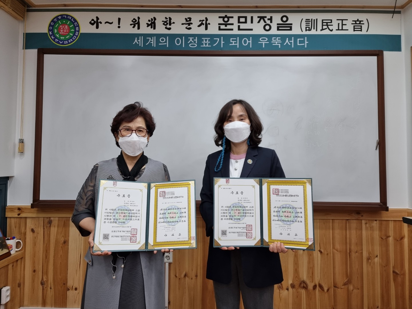 이들은 연수 후 실시한 제1회 훈민정음해설사 자격시험에서도 우수한 성적으로 합격의 영광을 얻어 국내 최초의 훈민정음해설사 1호와 2호 자격을 나란히 취득하였다. 훈민정음해설사 자격시험은 사단법인 훈민정음기념사업회 산하 훈민정음탑건립조직위원회가 시행하는 민간자격으로 교육부 소관 제2021-002430호로 등록된 민간자격이다.
