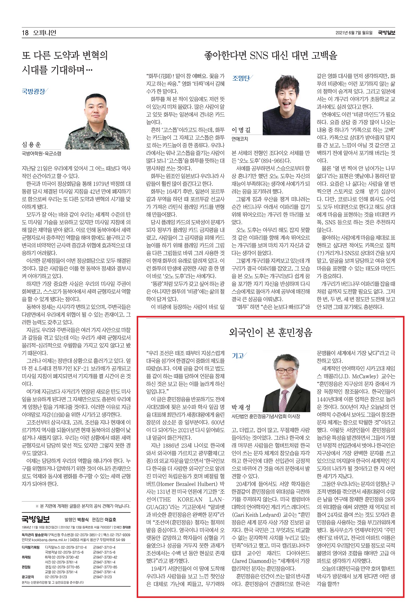 [국방일보](지면) 외국인이 본 훈민정음-박재성 칼럼