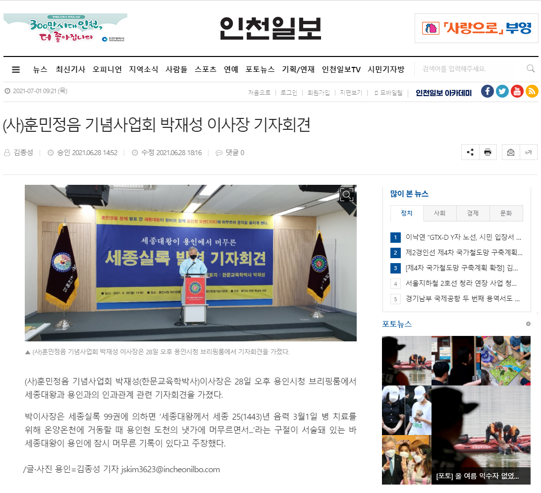 [인천일보](사)훈민정음기념사업회 박재성 이사장 기자회견