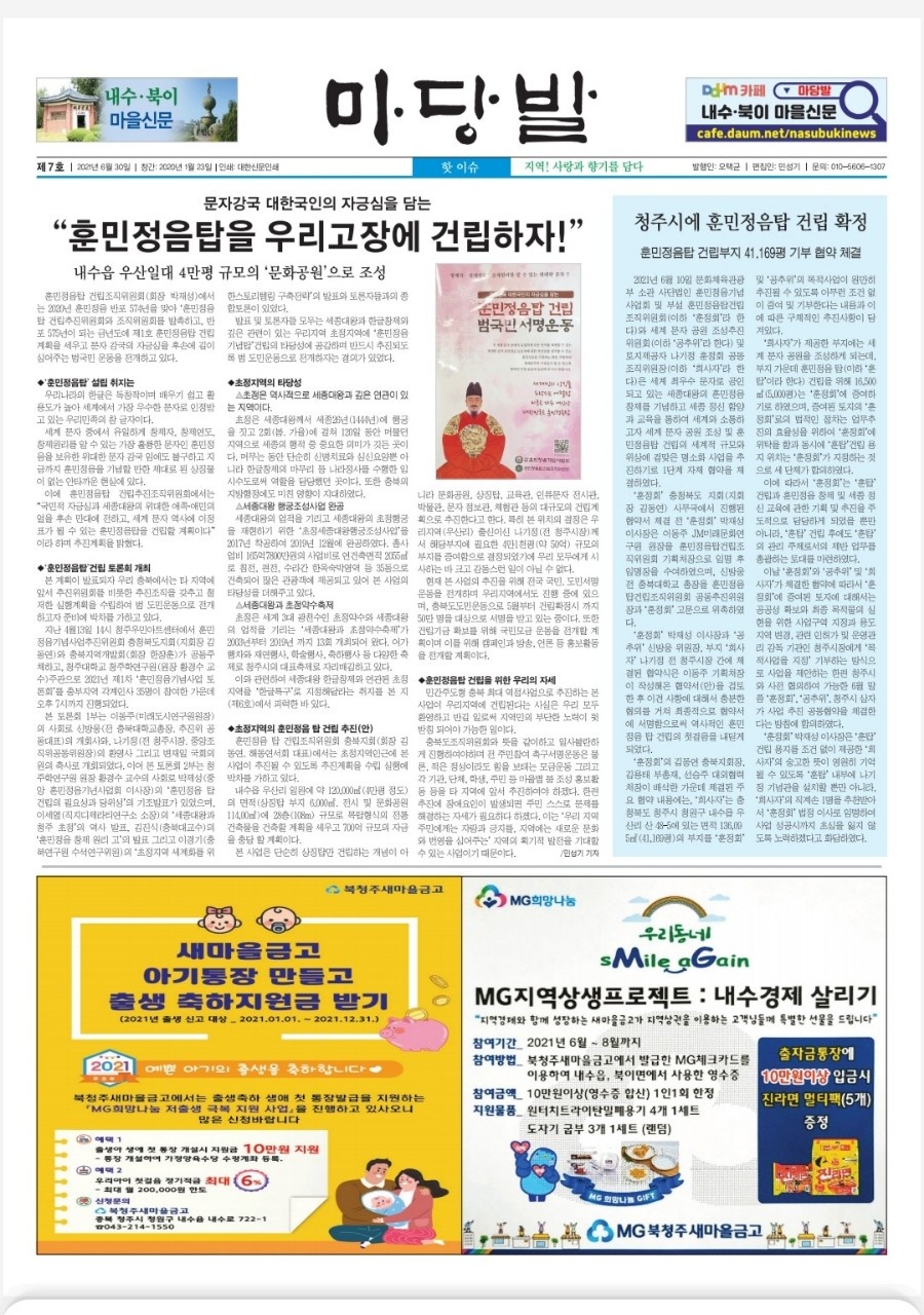 지역신문 마당발에 훈민정음탑 건립관련 상세보도(충북지회)