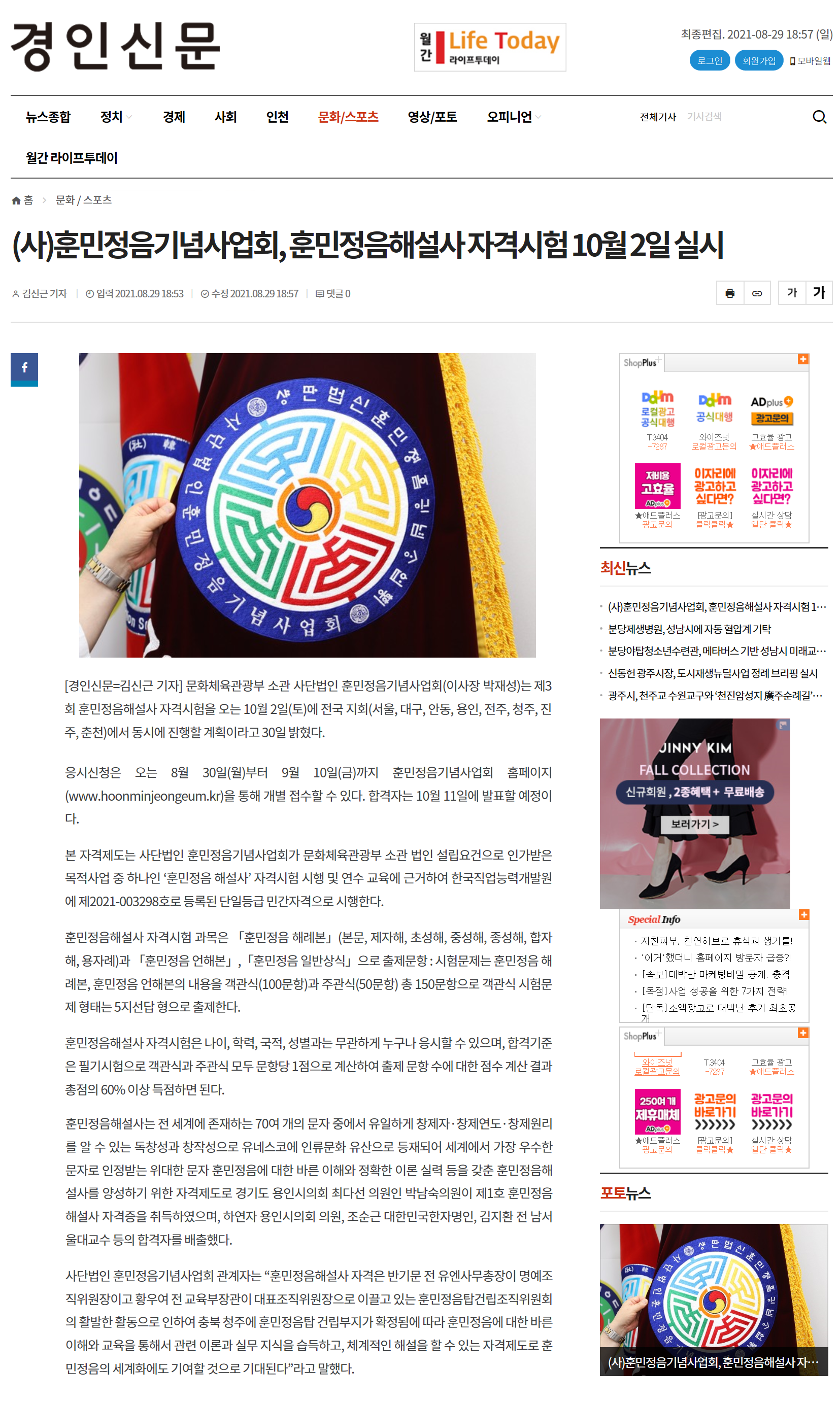 [경인신문]제3회 훈민정음해설사 자격시험 시행