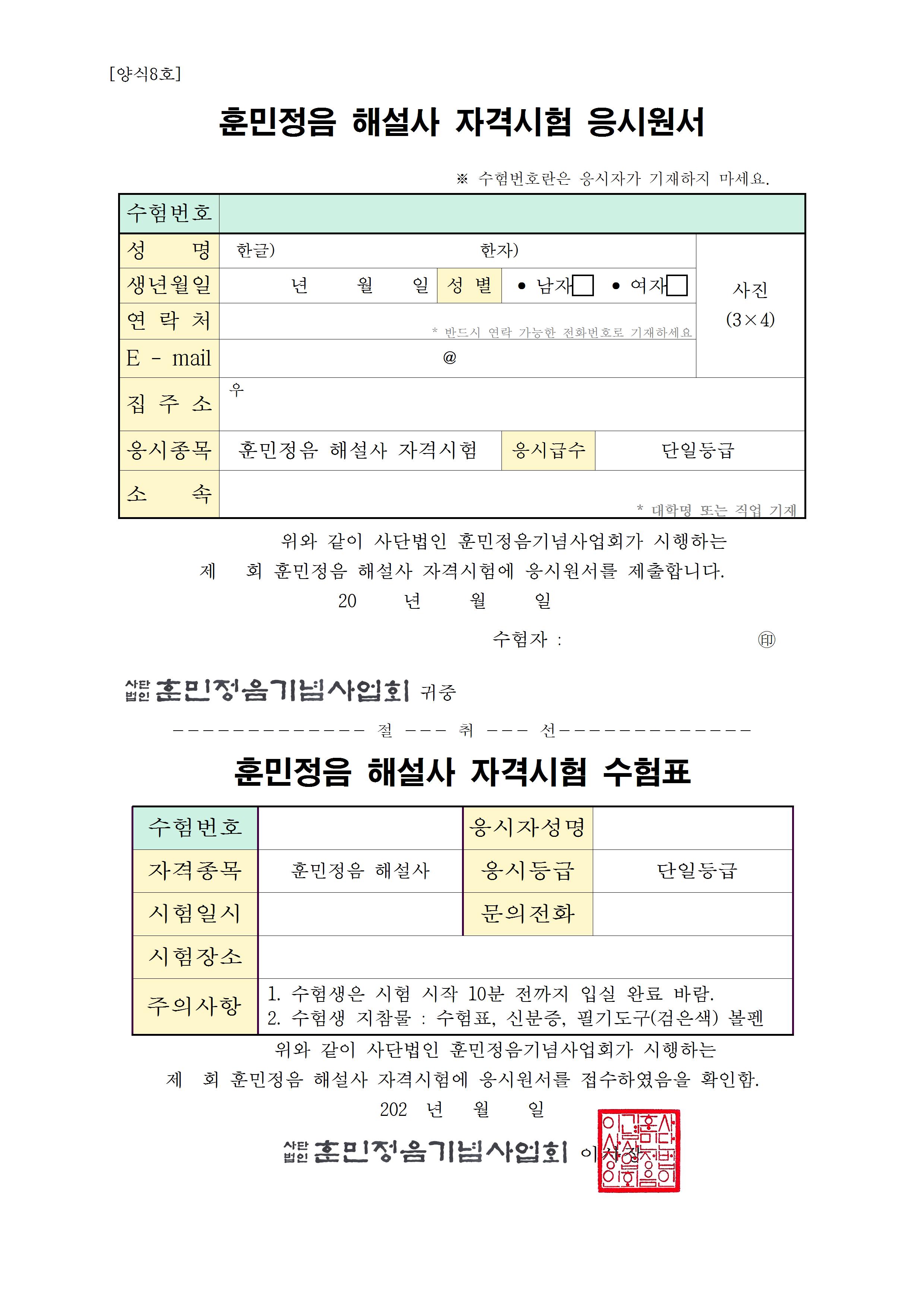 [양식8호] 훈민정음해설사 자격시험 응시원서