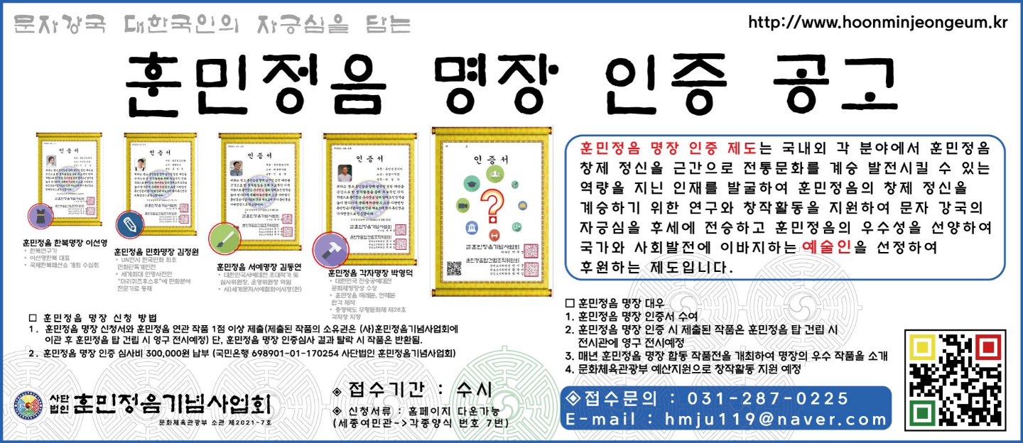 2. 훈민정음 명장 인증 시 제출된 작품은 훈민정음 탑 건립 시 전시관에 영구 전시 예정