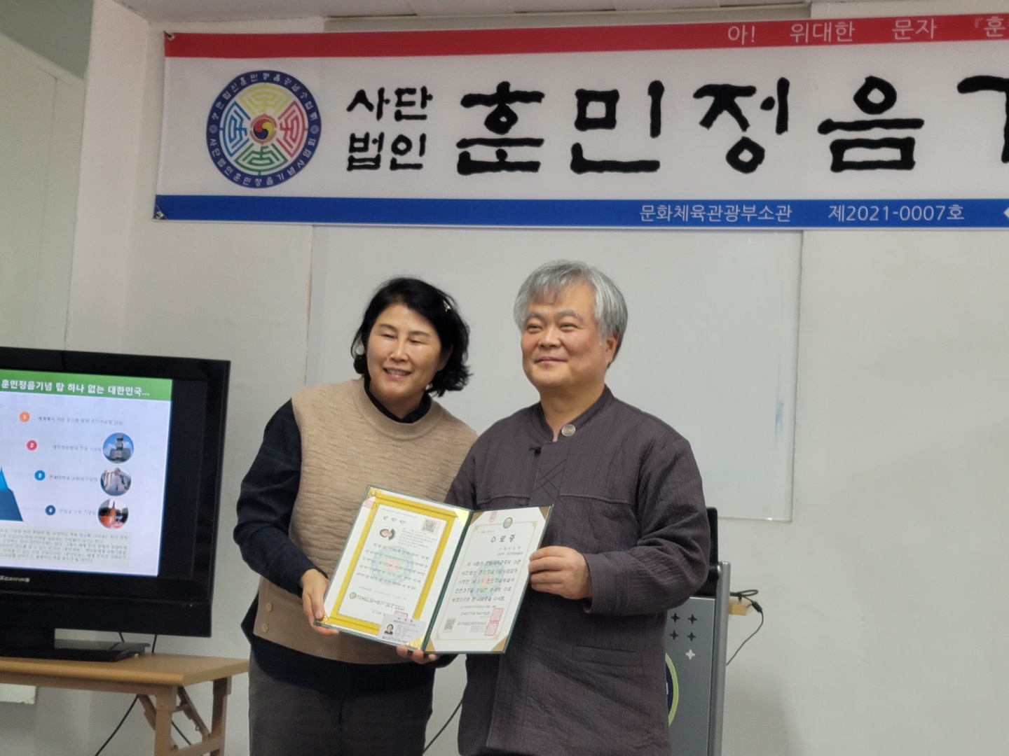 연수 종료후 박재성 교수는 수강생들에게 제3회 훈민정음해설사 자격증과 제3기 훈민정음 전문과정 연수 수료증 및 기념품을 수여하고 격려하였으며, 이날 홍수연 전북지회장을 보필하여 훈민정음기념사업회 전북지회를 이끌어갈 부지회장으로 연수생 중 강창구씨를 전북지회 부지회장으로 임명하였다.<홍수연 전북지회장>