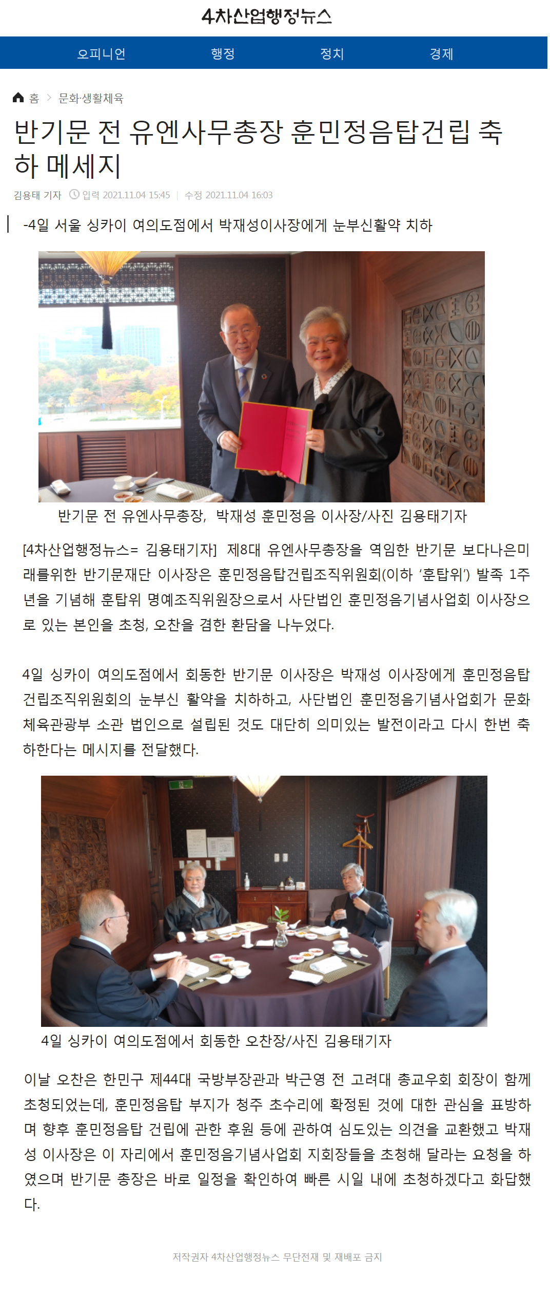 [4차산업행정뉴스] 반기문 전 유엔사무총장 훈민정음탑건립 축하 메세지