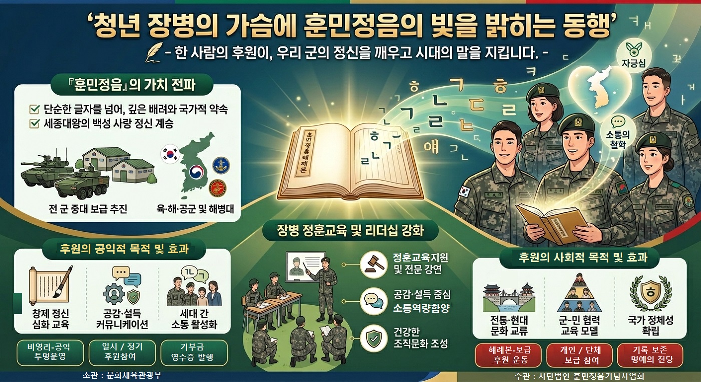 이 후원은 거창한 기부를 요청하는 일이 아니라, 대한민국의 뿌리인 『훈민정음』의 정신을 우리 군의 미래와 함께 지켜보겠다는 조용한 동행의 약속입니다. 한 사람의 뜻이 모여, 병영의 문화가 바뀌고 한 시대의 자긍심이 이어집니다.