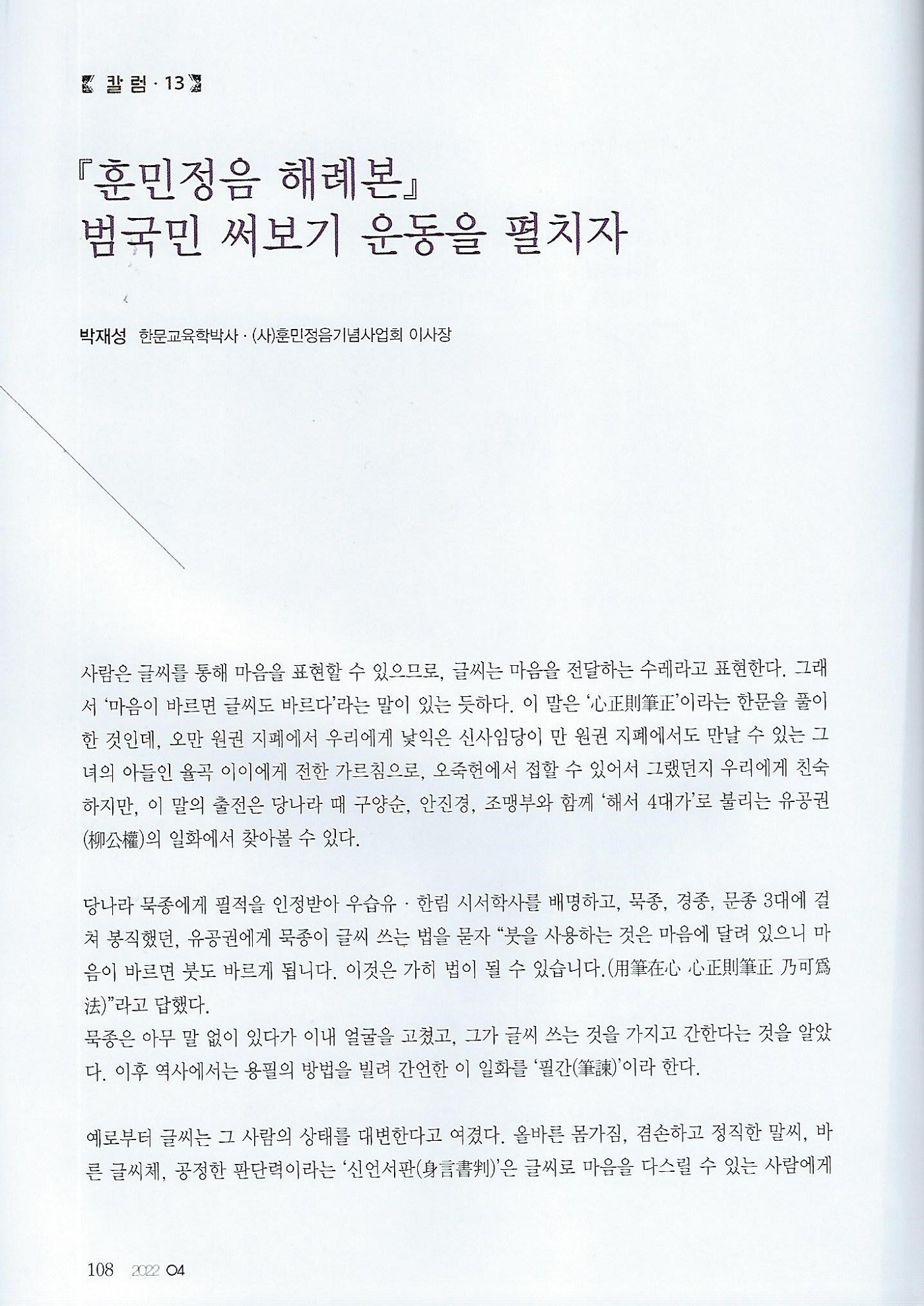[칼럼13] 훈민정음 해례본 범국민 써보기 운동을 펼치자