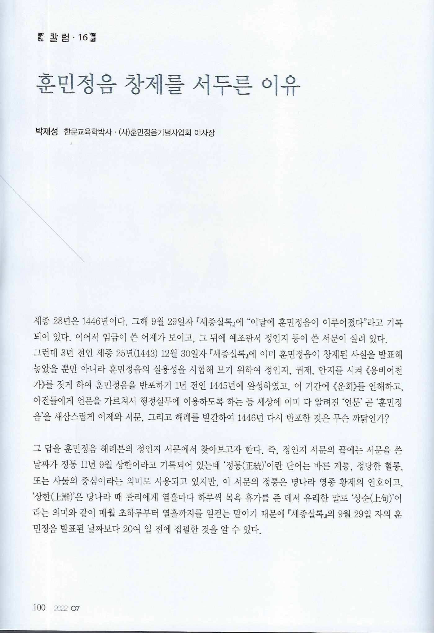 [칼럼17] 훈민정음 해례본 당신은 누구입니까?