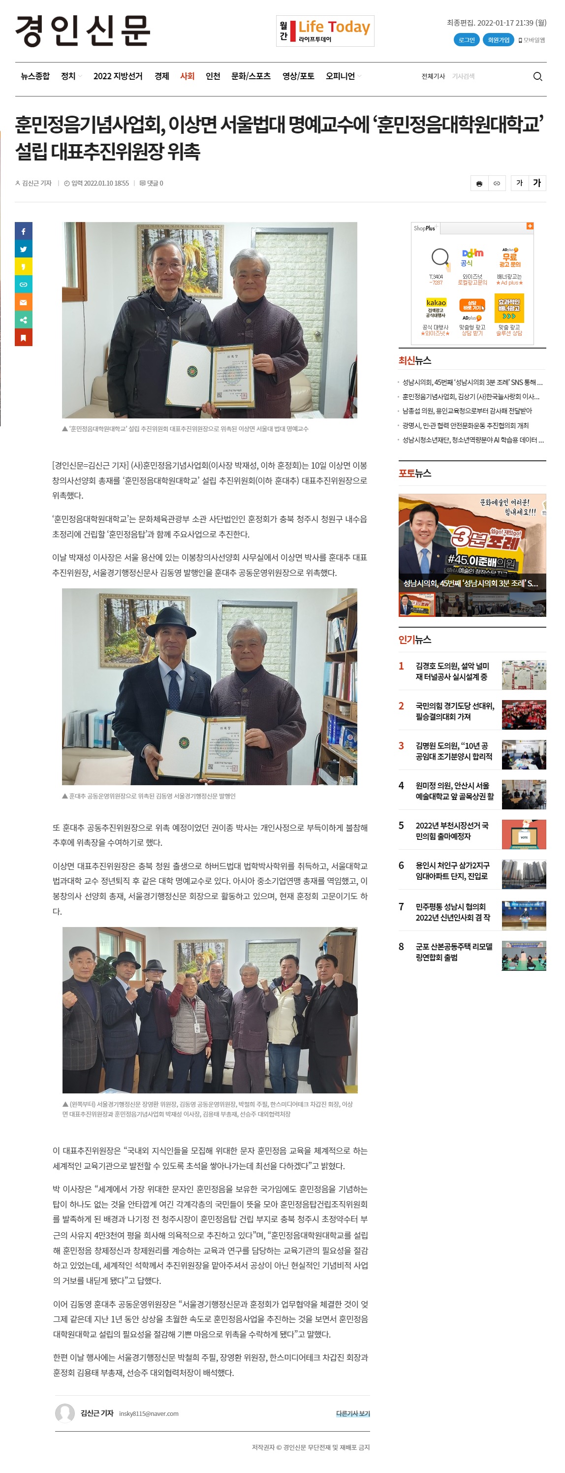 [경인신문] 훈민정음대학원대학교설립추진위원회 위원장 위촉