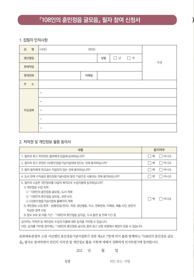 [양식14호] 108인의 훈민정음 글모음 필자 참여 신청서