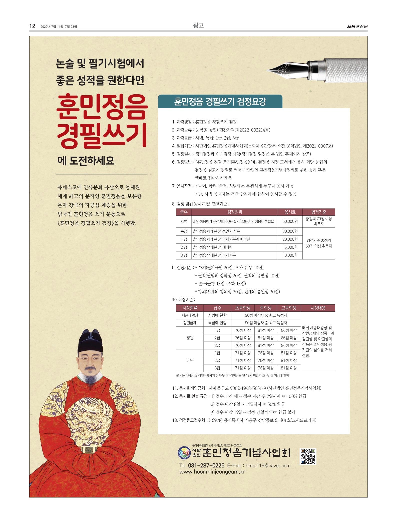 <훈민정음 경필쓰기> 새용산신문 12면 전면 광고