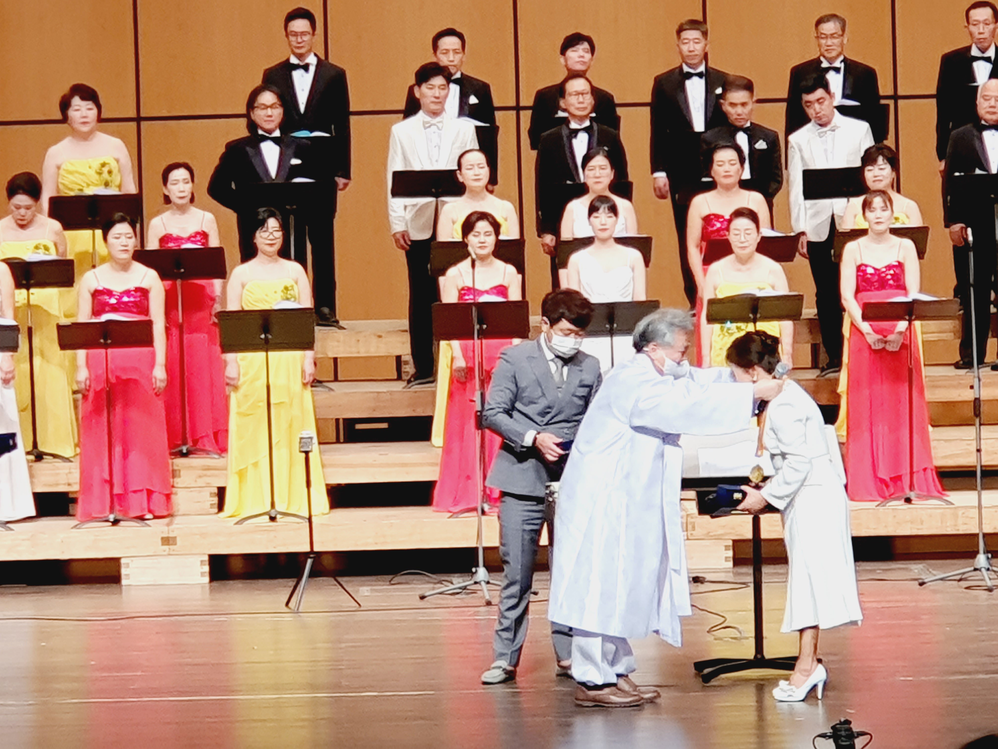이날 <훈민정음 노래> 공연 후 노영아 지휘자로부터 단상으로 올라와서 축사를 해달라는 요청을 받은 박재성 이사장은 훈민정음기념사업회의 설립취지와 <훈민정음 노래>를 작사하게 된 배경 등을 소개하고, 오병희 작곡가와 노영아 지휘자에게 감사패와 기념 메달을 수여하였다.