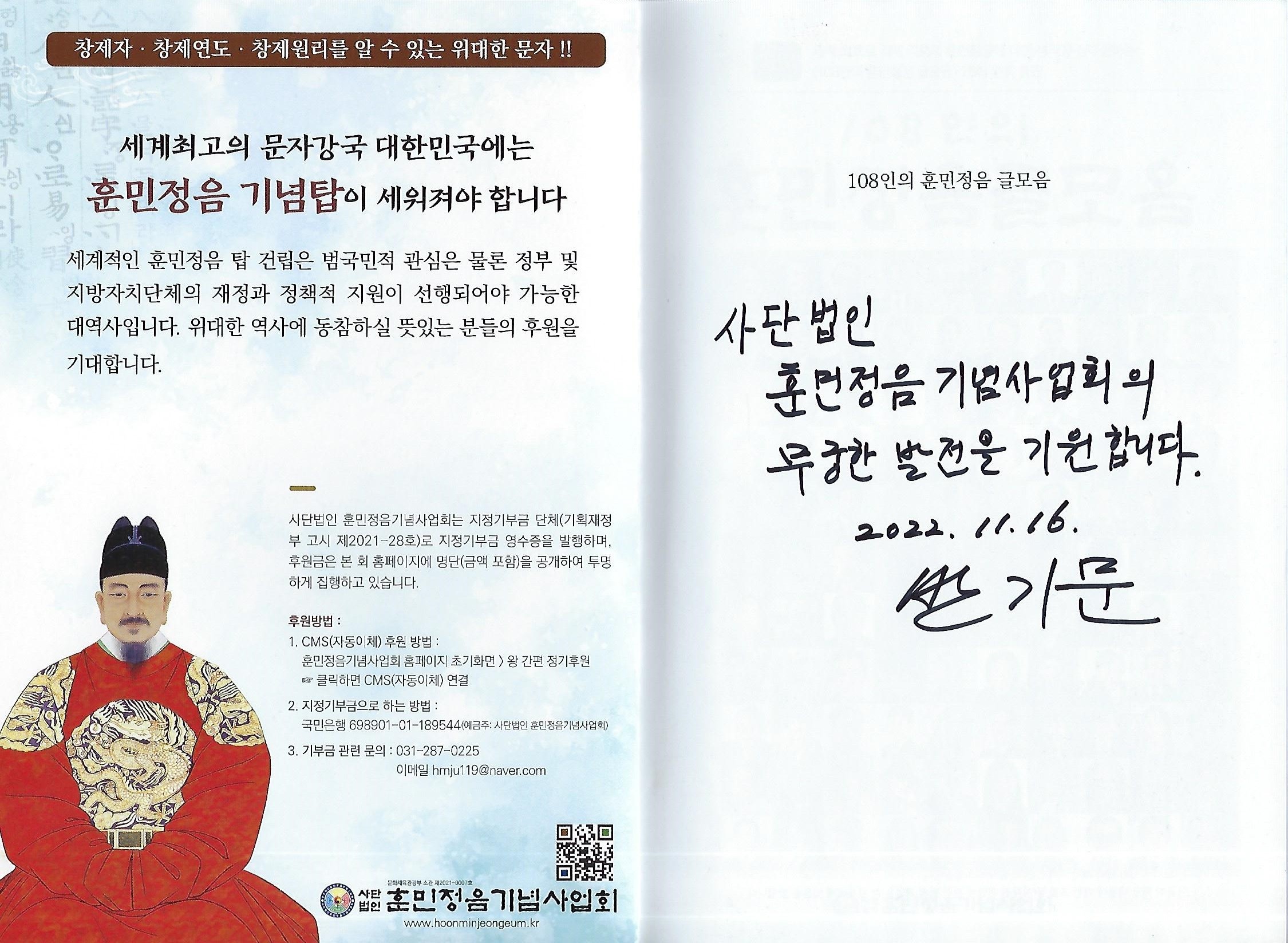 2022년 11월 16일(수) 오늘 오후 3시에 보다나은 미래를 위한 반기문 재단을 방문하여 반기문 전 유엔사무총장을 예방했을 때 별도로 준비해간 <108인의 훈민정음 글모음> 도서에 "사단법인 훈민정음기념사업회의 무궁한 발전을 기원합니다."라는 격려의 말씀을 남겨주셨다.