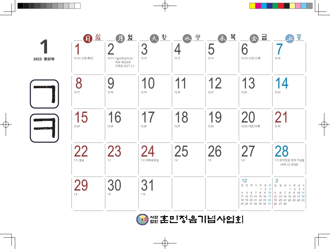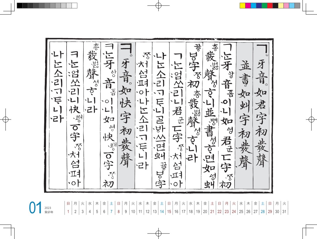 3. 매 달마다 훈민정음 28를 2개 글자 씩 <훈민정음해례본>의 글꼴로 배열하였다.