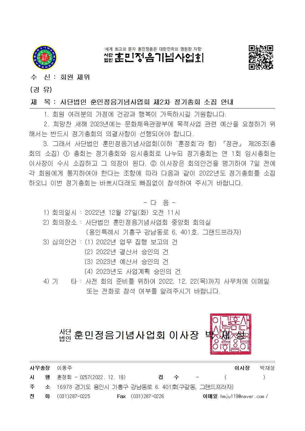 사단법인 훈민정음기념사업회 제2차 정기총회 소집 공고