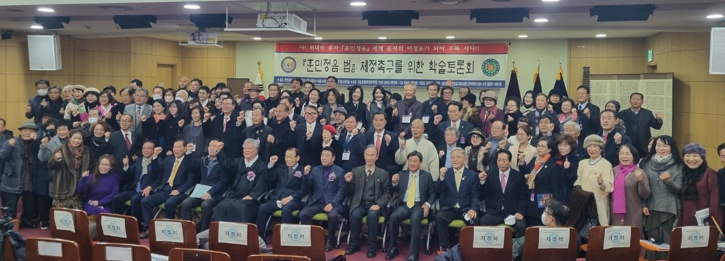 훈민정음 법 제정 촉구를 위한 학술토론회가 12월 14일(수) 국회의원회관 제2소회의실에서 오후 2시부터 6시까지 열렸다. 3백여 명이 참석한 가운데 개최된 이번 행사는 본행사와 학술토론회 순으로 이어졌는데 훈민정음 노래, 도서 헌정, 시조 낭송, 축하공연, 축사 등으로 진행되었다.