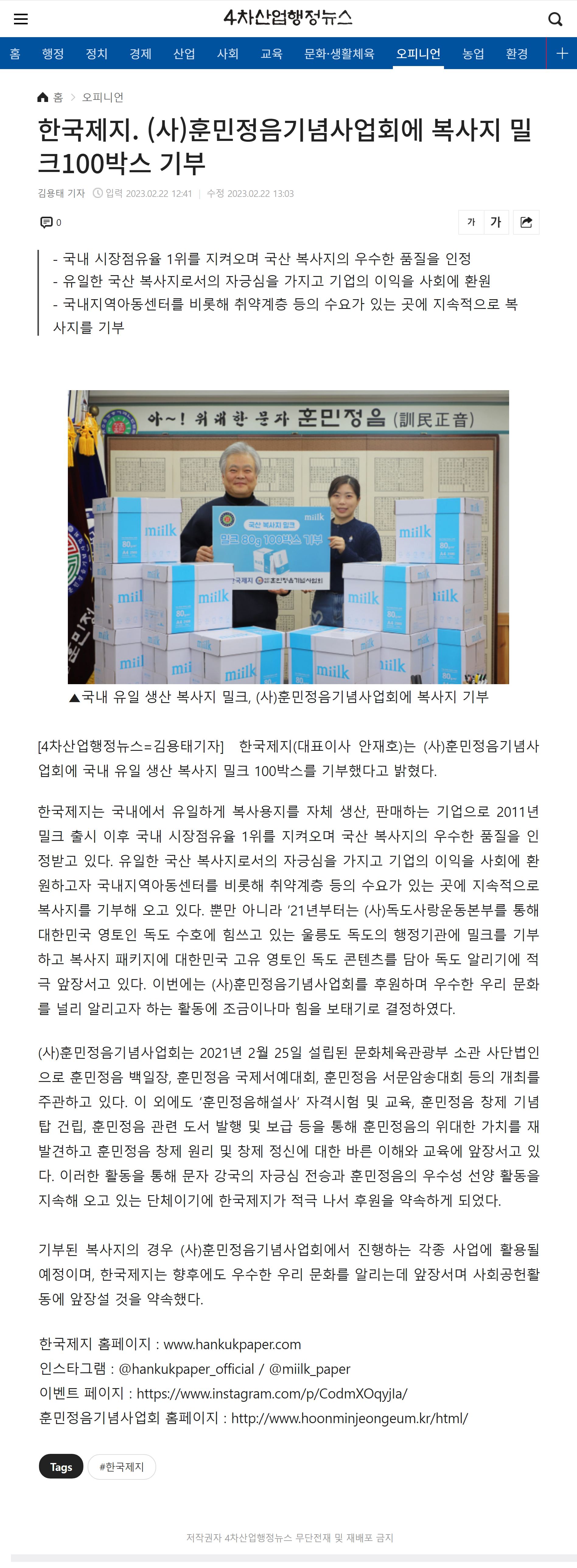 [4차산업행정뉴스] 한국제지,(사)훈민정음기념사업회에 복사지 기부
