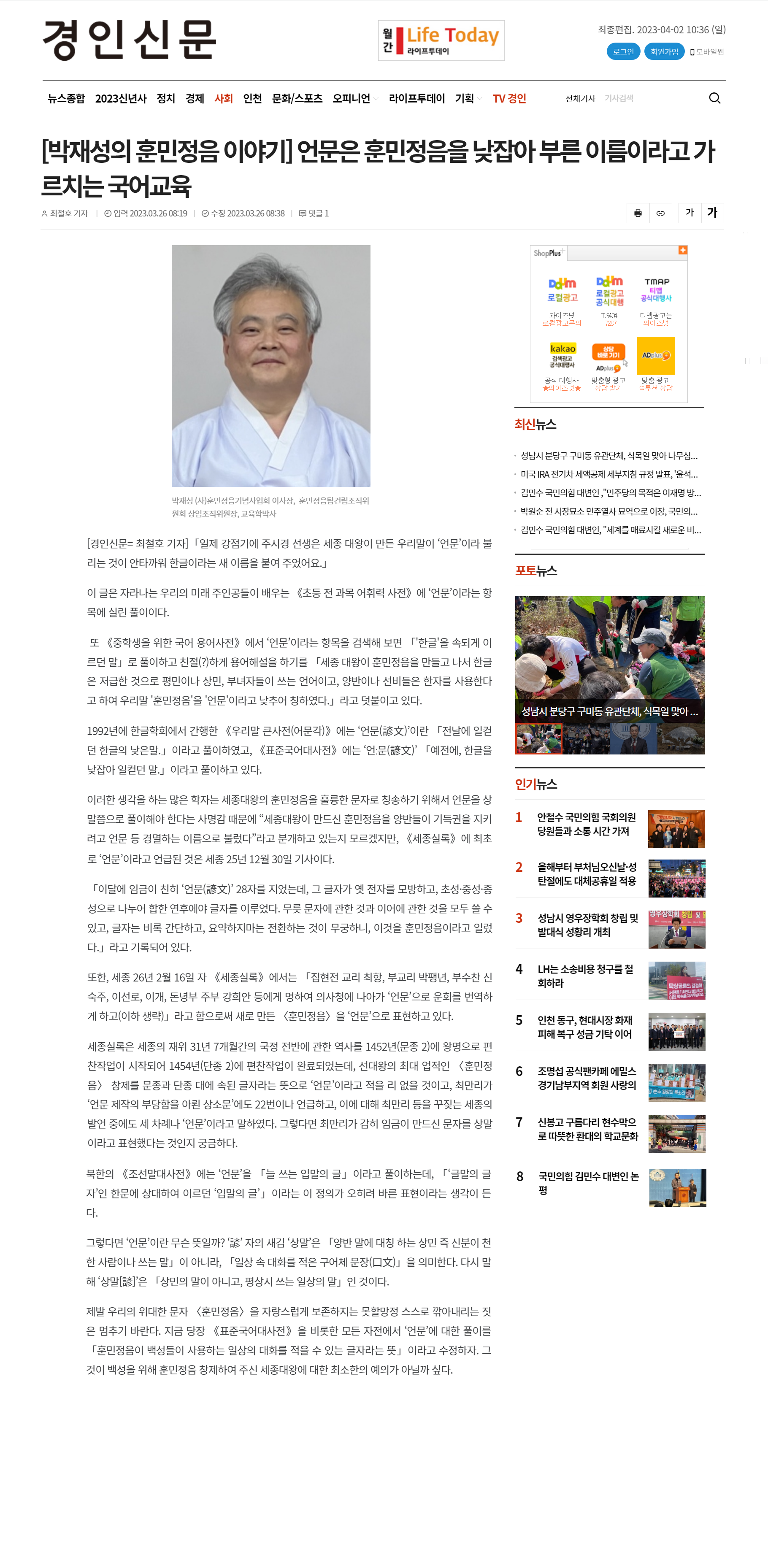 [경인신문] 언문은 훈민정음을 낮잡아 부른 이름이라고 가르치는 국어교육