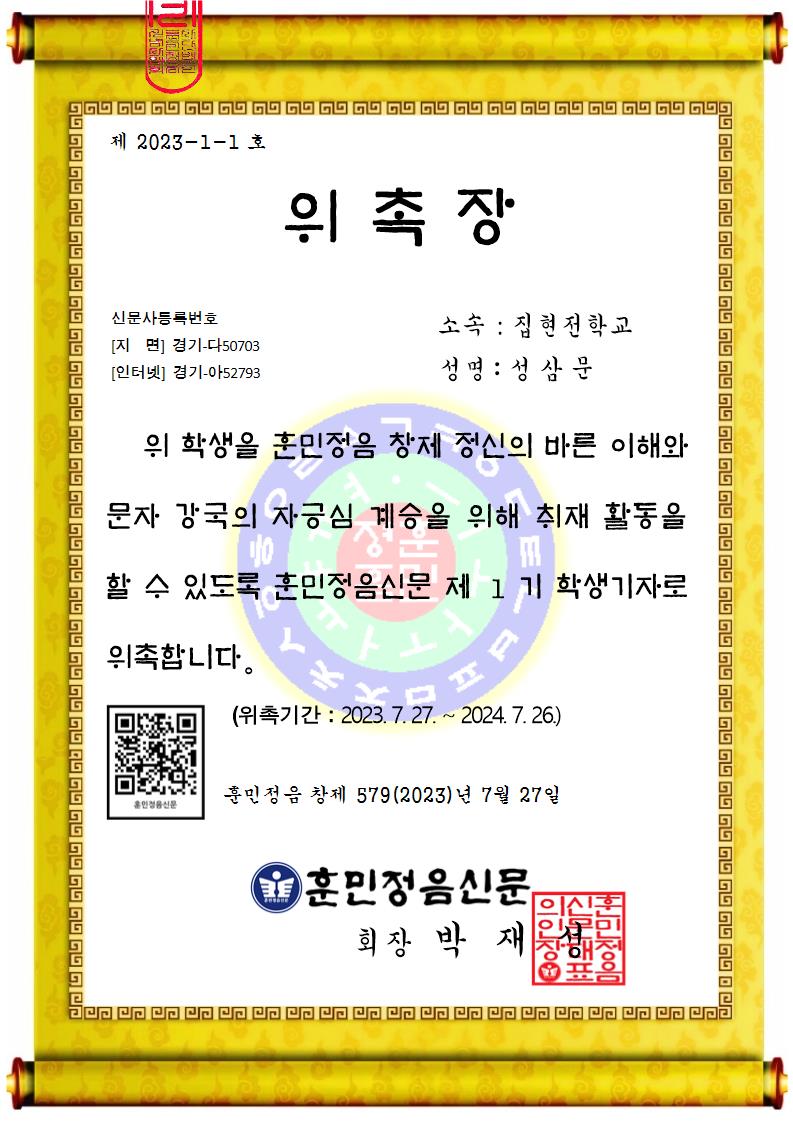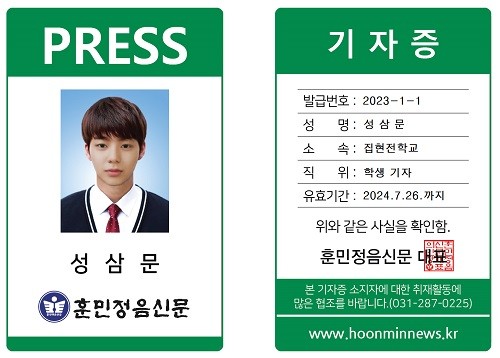 이중 엄정한 심사를 거쳐서 영광의 제 1 기 훈민정음 신문 학생 기자 35명을 선발하여 다음과 같이 훈민정음 신문 학생 기자 위촉장 및 기자증 수여식을 거행한다.