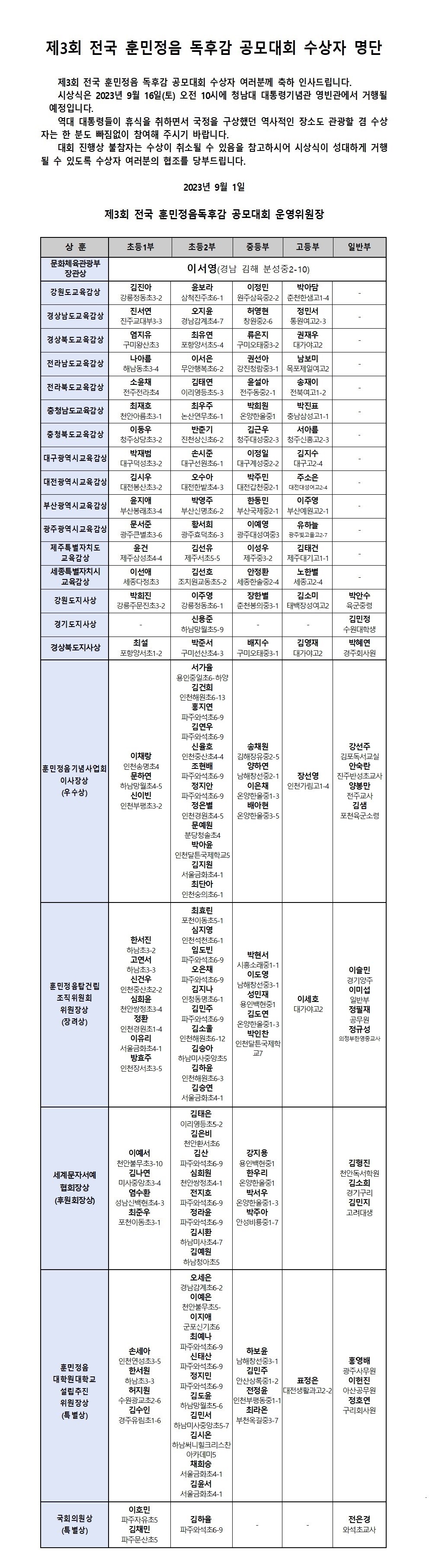제3회 전국 훈민정음 독후감 공모대회 심사결과 발표