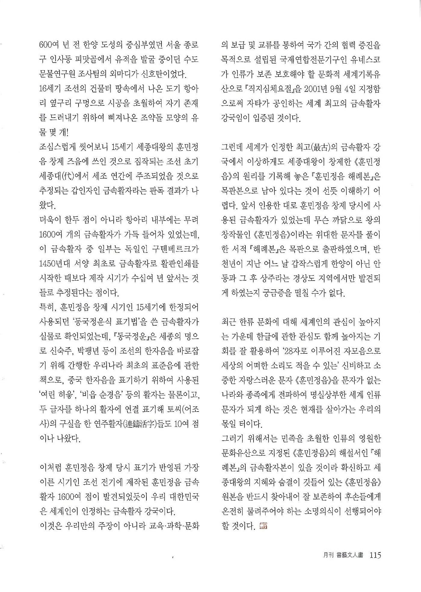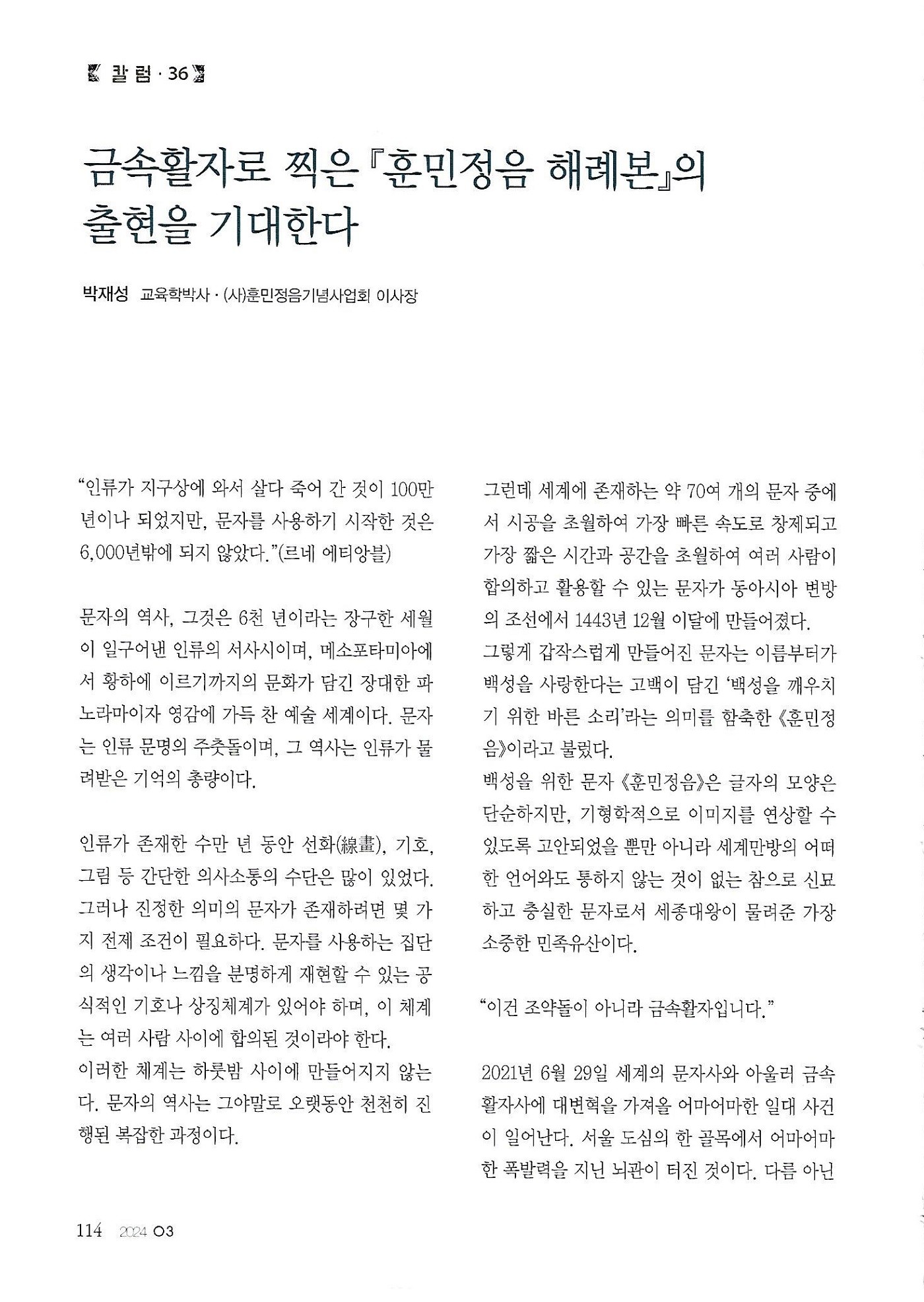 [칼럼36] 금속활자로 찍은 <훈민정음 해례본>의 출현을 기대한다