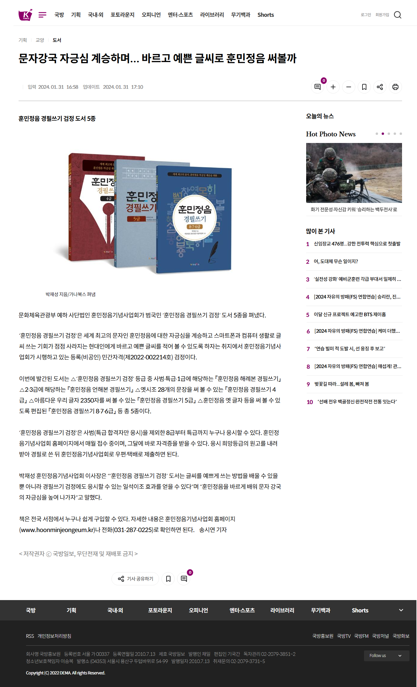[국방일보](인터넷판) 문자강국 자긍심 계승하며...바르고 예쁜 글씨로 훈민정음 써볼까