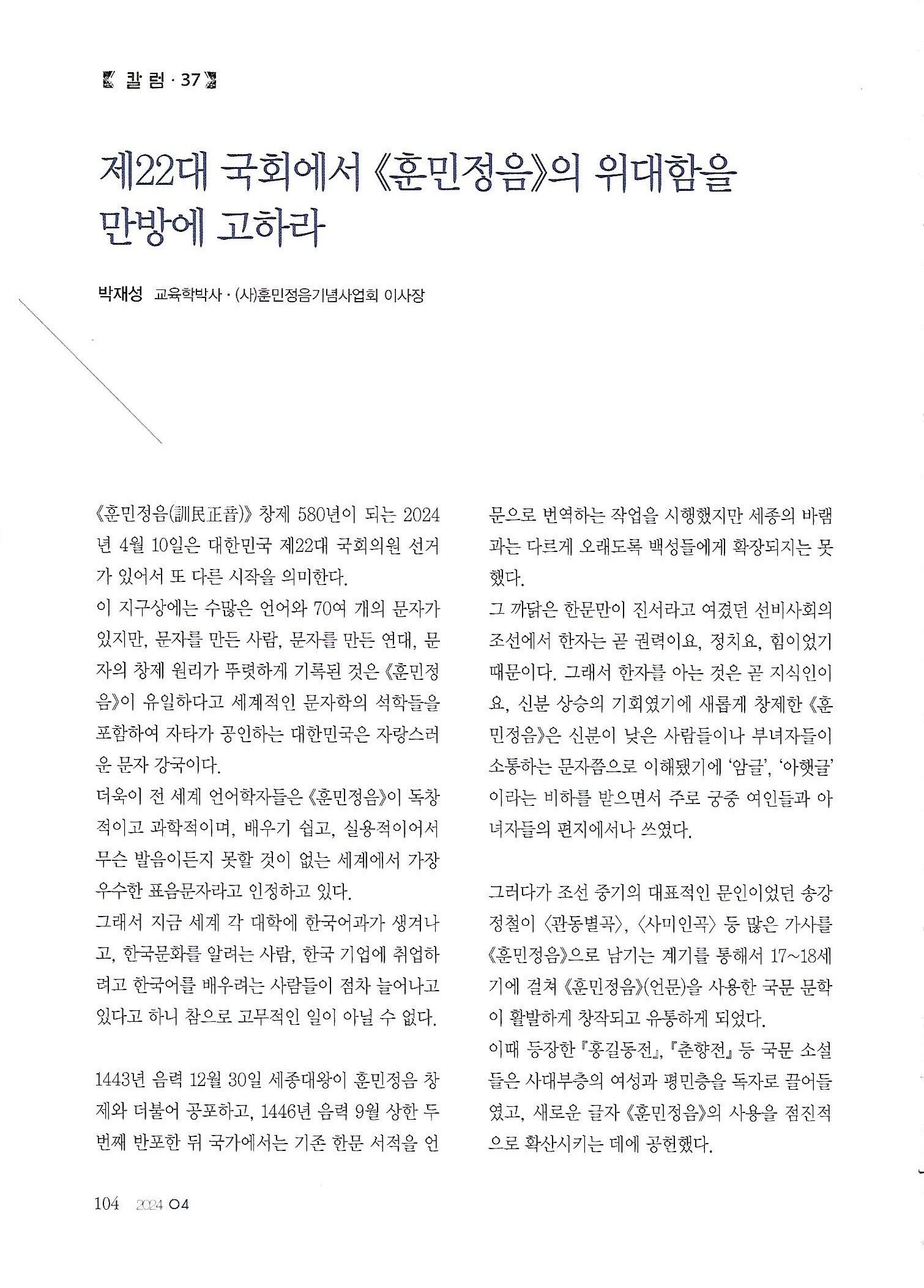 [월간서예문인화] 제22대 국회에서 훈민정음의 위대함을 만방에 고하라.