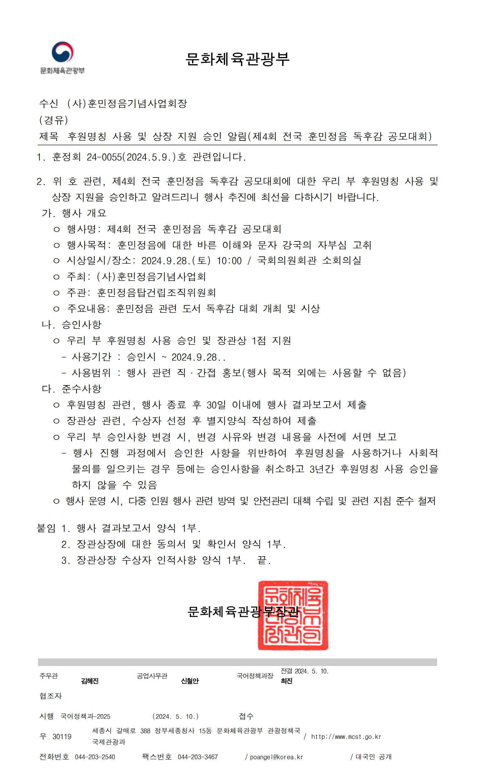 제4회 전국 훈민정음 독후감 공모대회 문화체육관광부 장관상 수여 및 공식 후원 승인