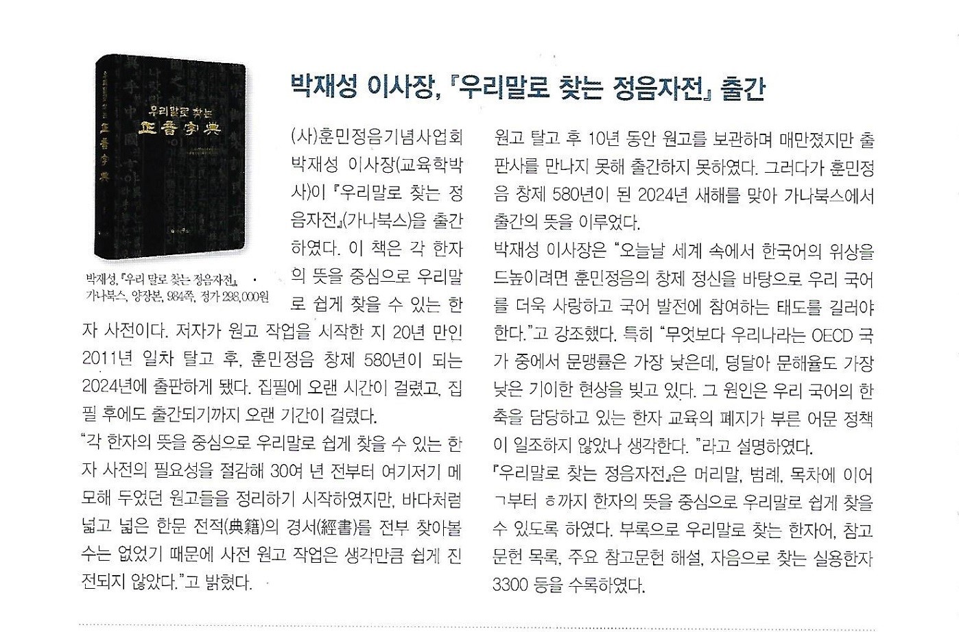 그러나 선뜻 이 원고를 발행할 출판사를 만나지 못하여 10여 년 동안 보관만 하고 있었는데, 훈민정음 창제 580돌이 되는 2024년 새해를 맞이하여 뜻밖에도 출판 유통의 백년가게 가나북스에서 출판하겠다고 큰 결단을 해주시니 기왕이면 이 자전이 더 많은 사람에게 활용될 수 있게 되었으면 좋겠다는 마음으로 보완하여 세상에 내놓는다.