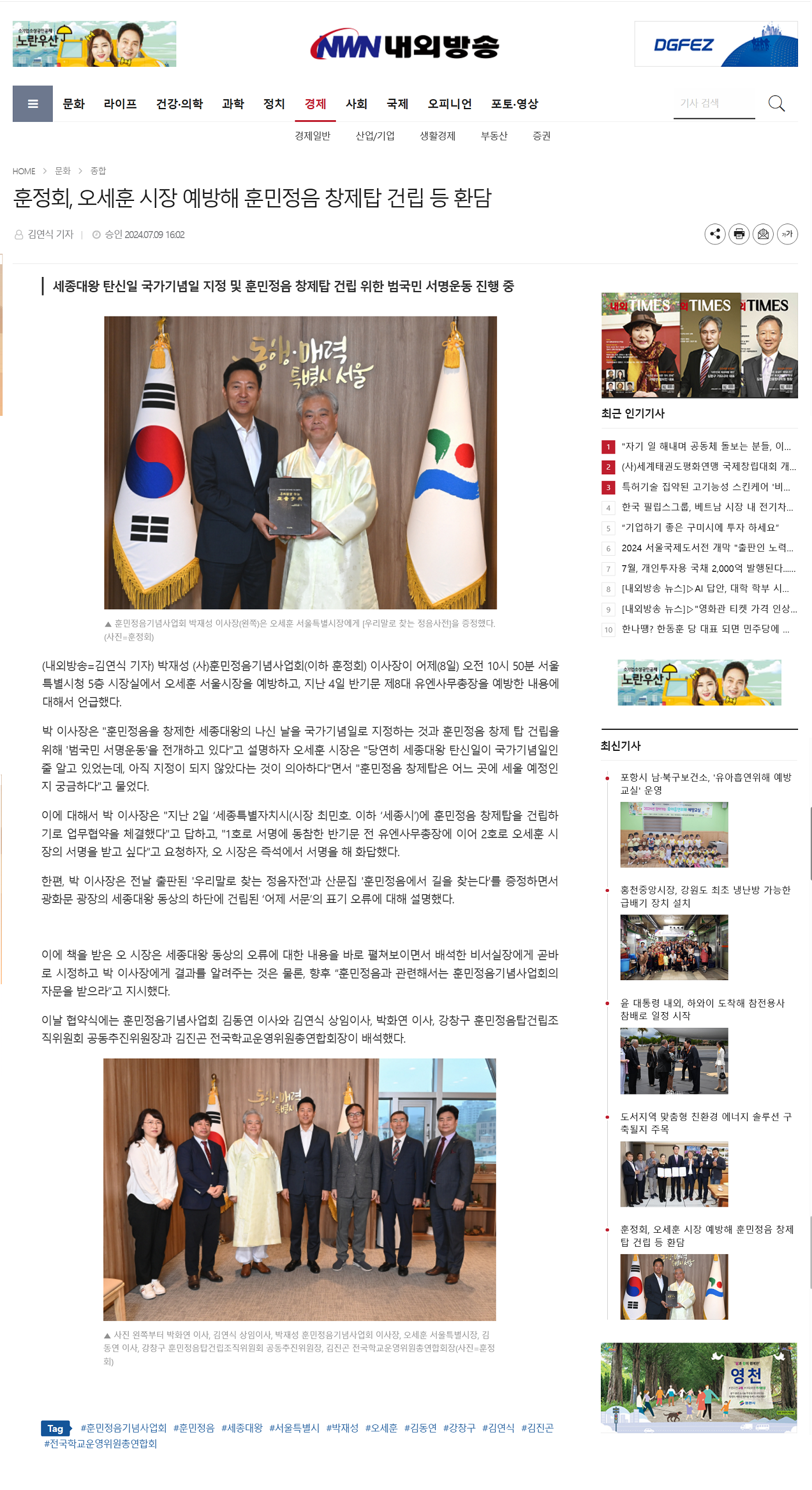 [내외방송] 훈정회, 오세훈 시장 예방해 훈민정음 창제탑 건립 등 환담