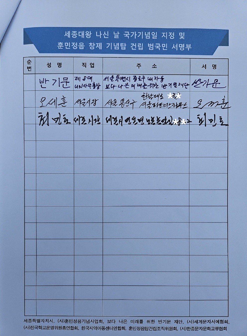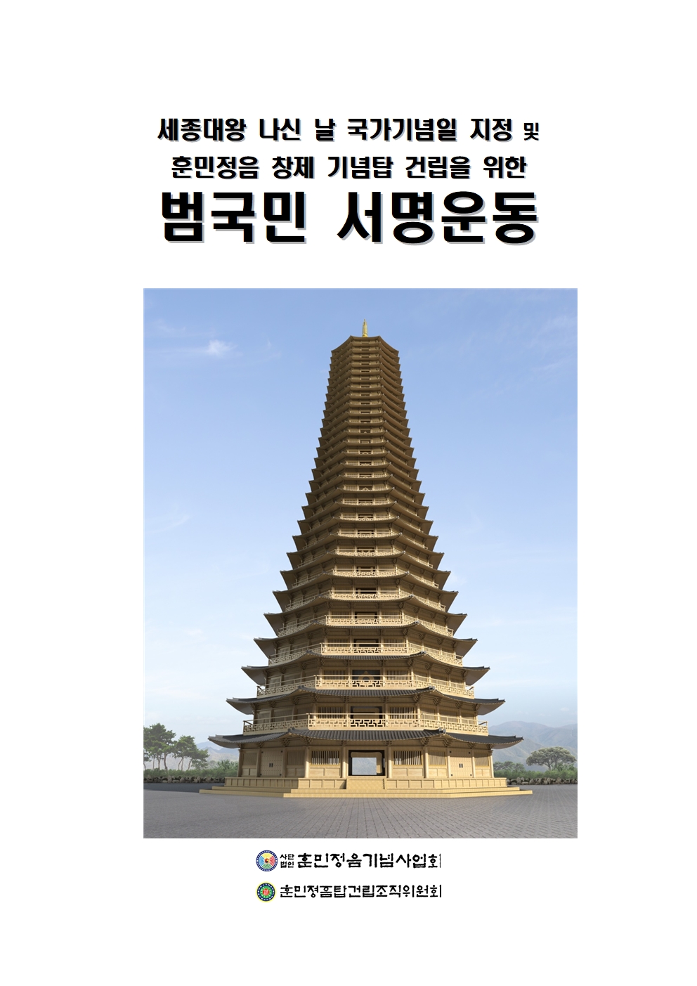 세종대왕 나신 날 국가기념일 지정 및 훈민정음 창제 기념탑 건립을 위한 범국민 서명운동 시작