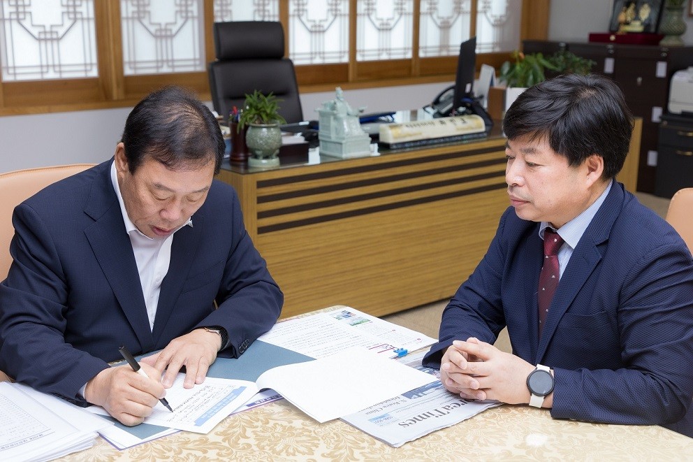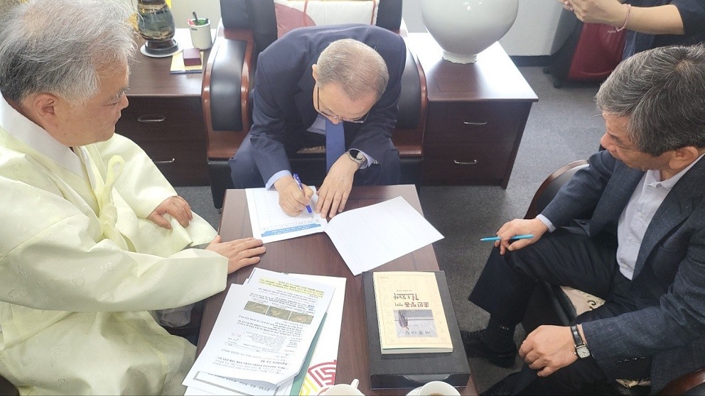 ▲ 「세종대왕 나신 날 국가 기념일 지정 및 훈민정음 창제 기념 탑 건립을 위한 범국민 서명 운동」에 세 번째로 서명하여 동참해 주신 최민호 세종특별자치시장, 오른쪽은 사단법인 훈민정음기념사업회 김연식 상임이사