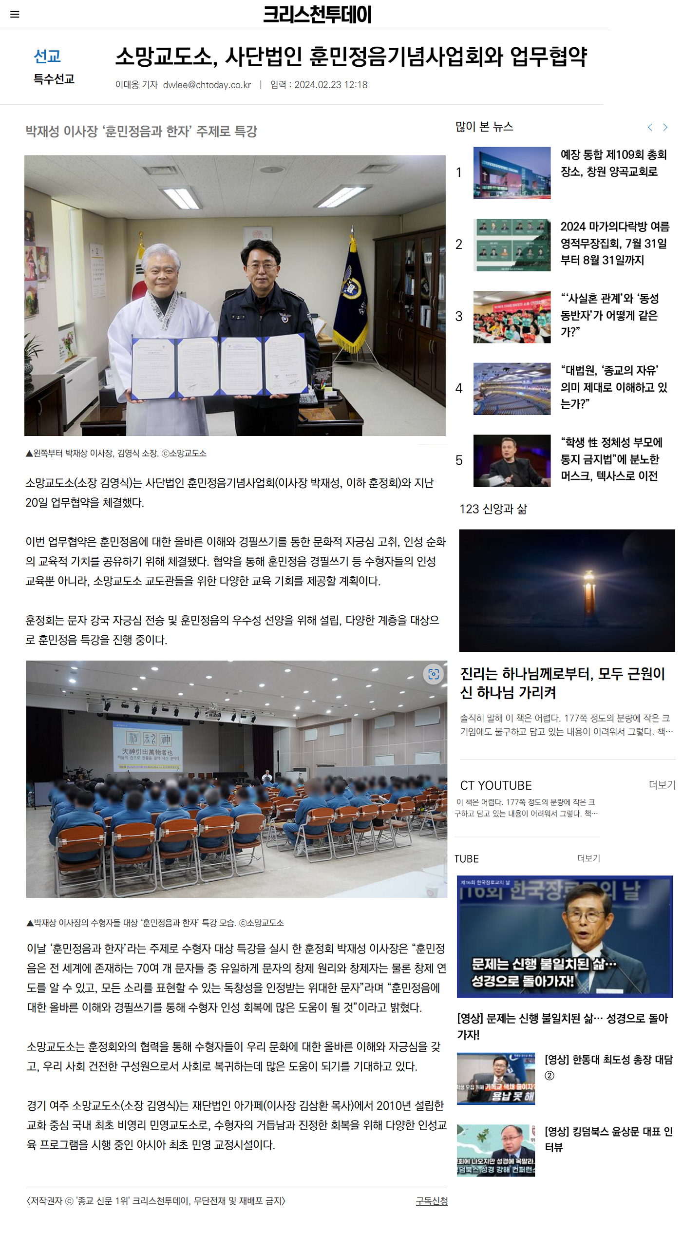 [크리스천투데이] 소망교도소, 사단법인 훈민정음기념사업회와 업무협약