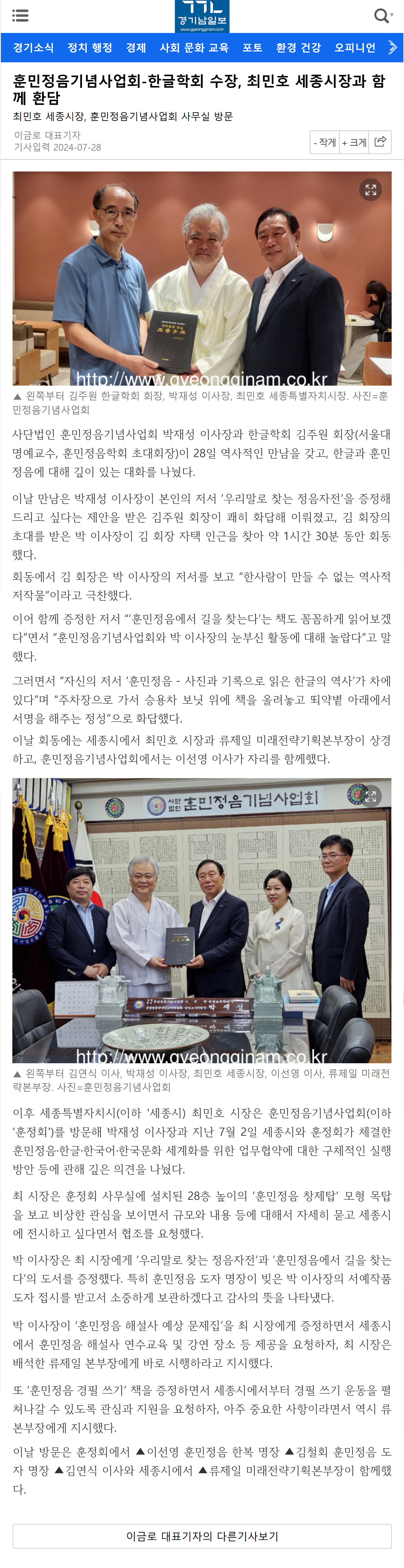 [경기남일보] 훈민정음기념사업회-한글학회 수장, 최민호 세종시장과 함께 환담