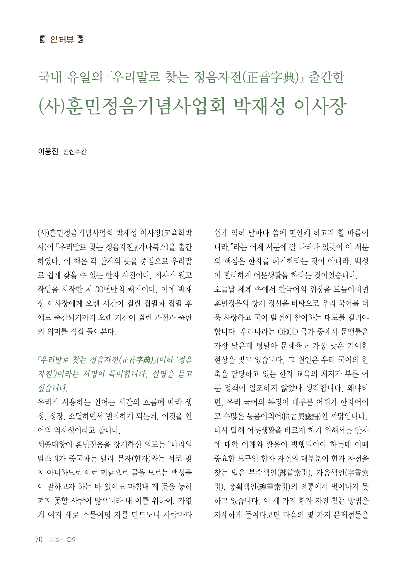 [월간서예문인화] 국내 유일의 '우리말로 찾는 정음자전' 출간한 박재성 이사장