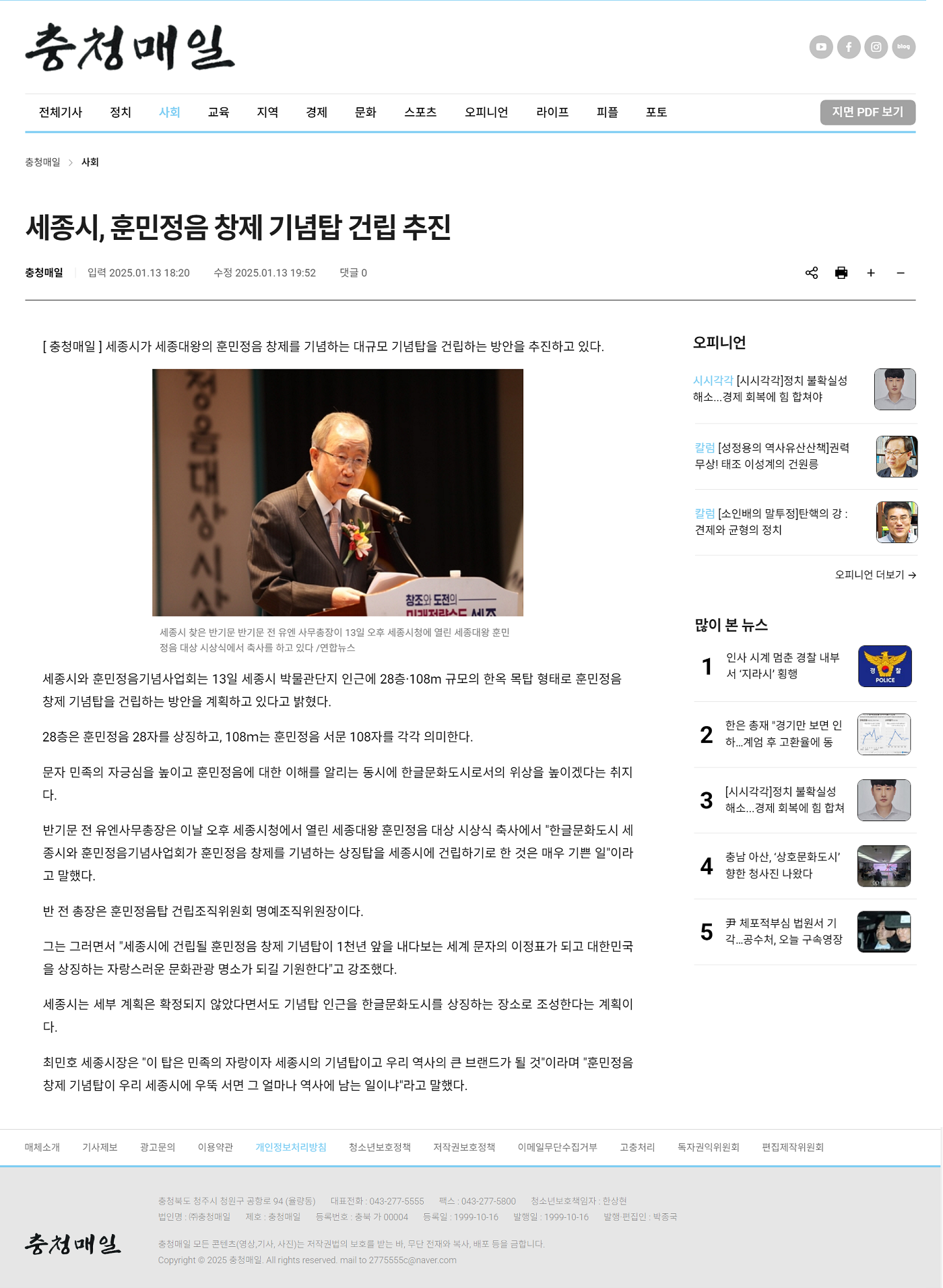 [충청매일] 세종시, 훈민정음 창제 기념탑 건립 추진
