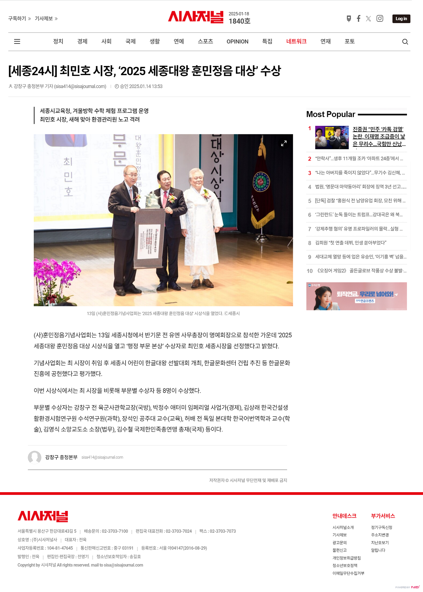 [시사저널] 최민호 시장, '2025 세종대왕 훈민정음 대상' 수상