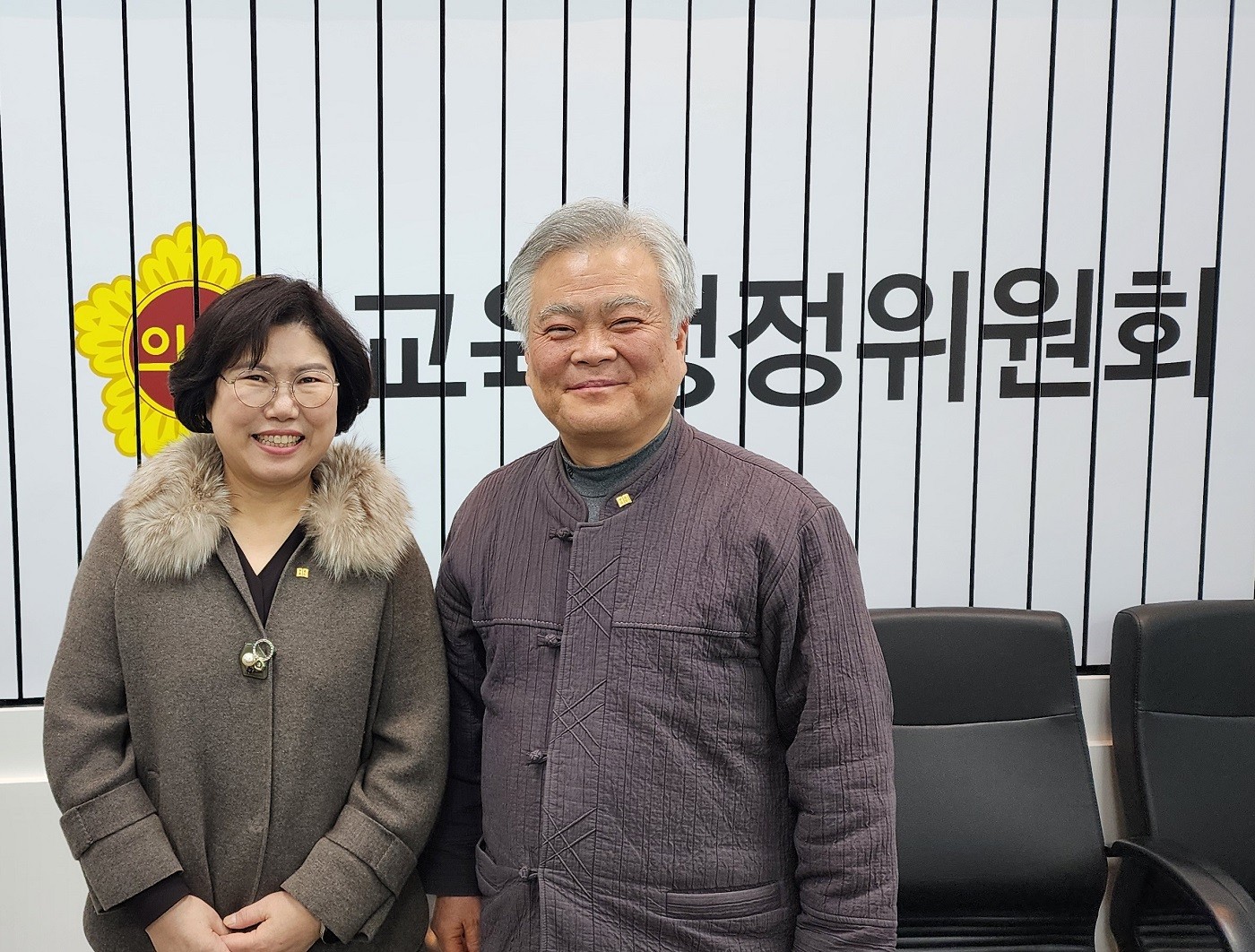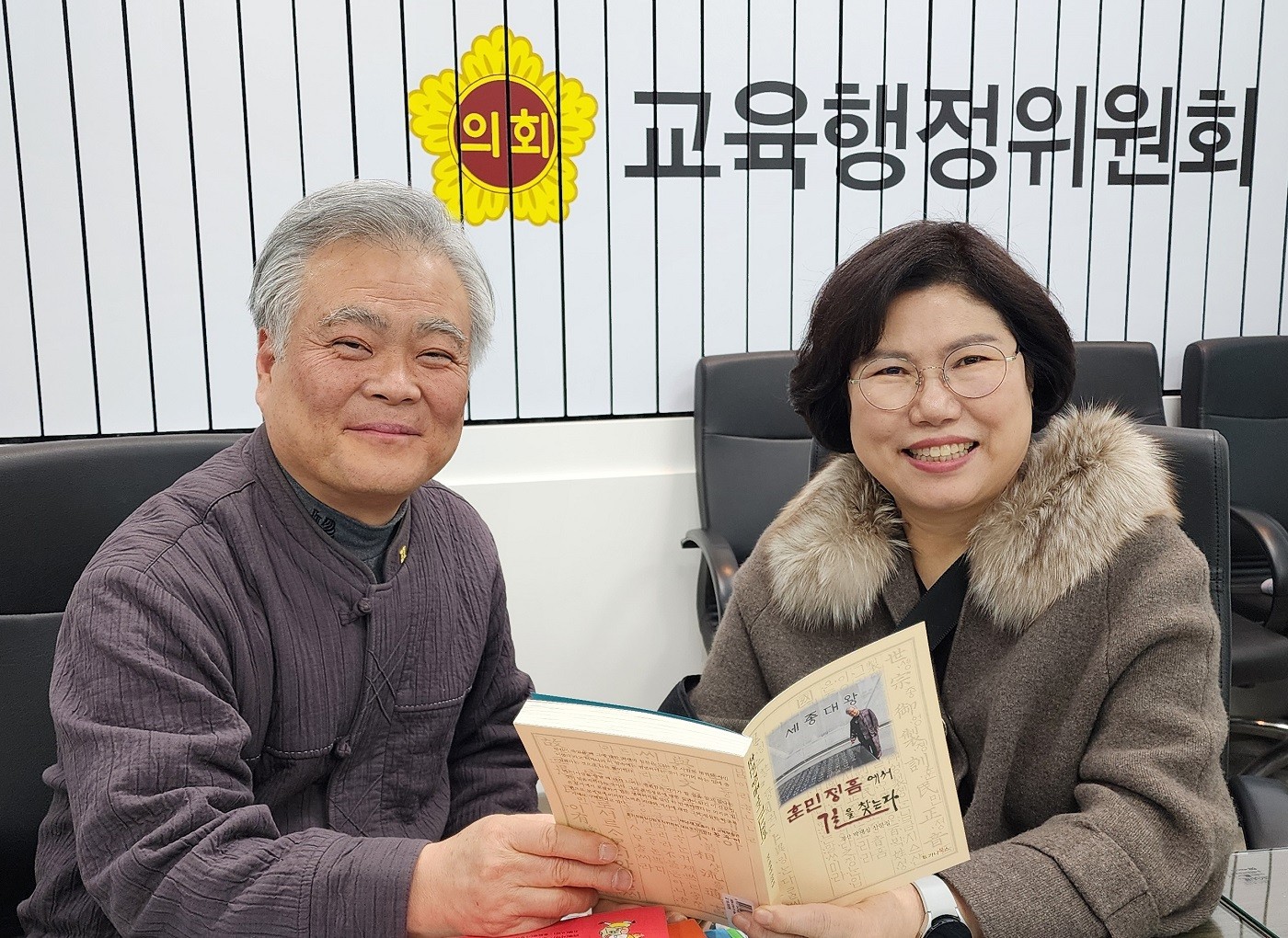 사단법인 훈민정음기념사업회(이하 '훈정회') 박재성 이사장은 2월 26일(수) 오후 4시30분 경기도의회 교육행정위원회 이애형 위원장의 초청을 받고 훈정회 이금로 이사(경기남일보 대표)와 함께 방문하였다. 이 자리에서 박이사장은 훈정회가 배출한 '훈민정음 해설사'들이 경기도내 초등학교에서 수업할 수 있는 방법을 모색해 달라고 요청하였고, 이위원장은 먼저 경기도교육연수원에서 박이사장이 강의를 하는 것이 순서일 것이라면서 경기도교육연수원 심한수 연수원장에게 전화를 걸어서 연결해 주었다. 박이사장은 준비해간 자신의 저서 <훈민정음에서 길을 찾는다>와 <어린이 훈민정음을 위한 교과서 한자어 전6권>을 증정하고, 이위원장에게 '훈민정음' 배지를 직접 달아 준 후 기념사진을 찍었다.<이금로 훈민정음신문 대기자>